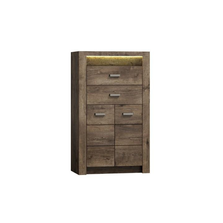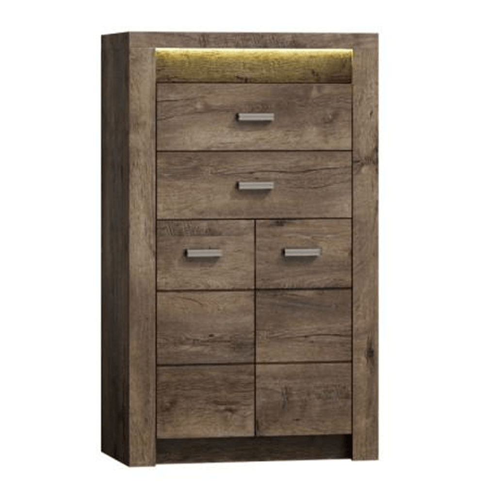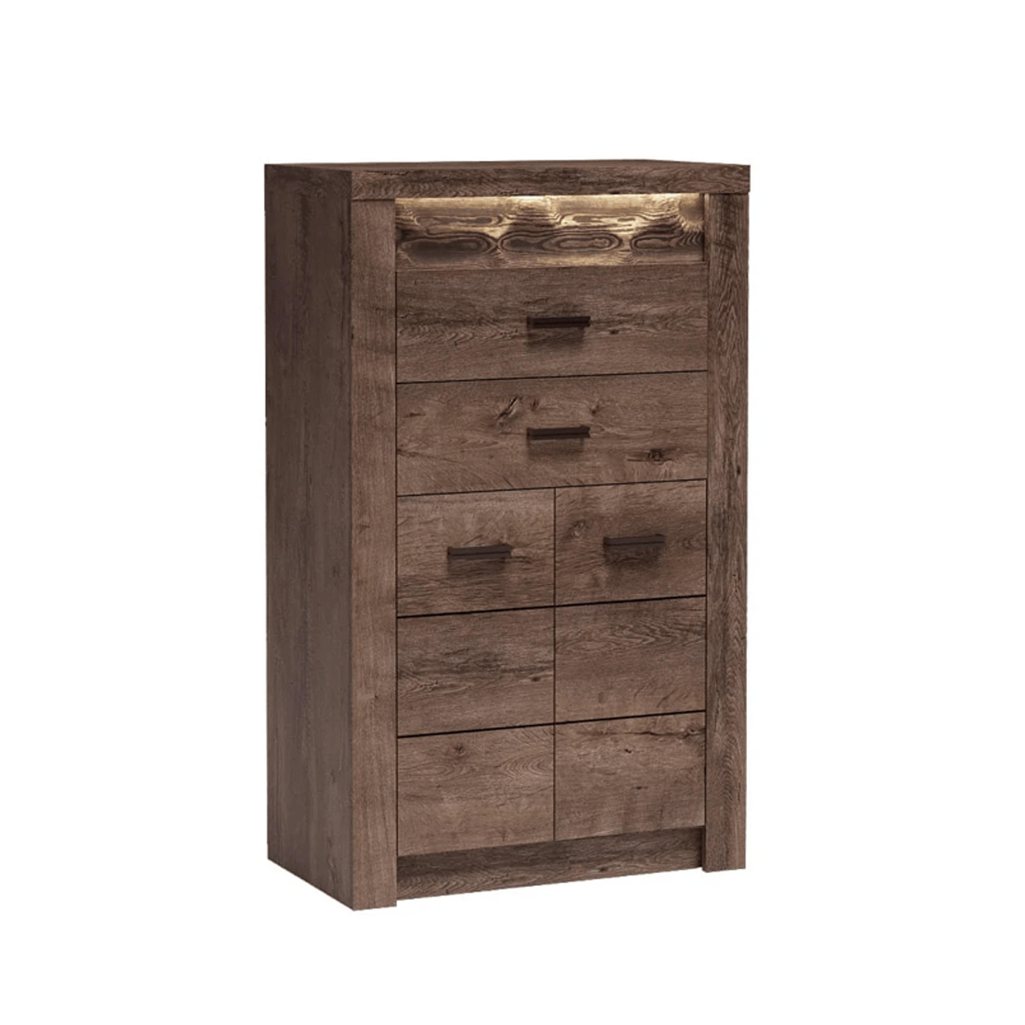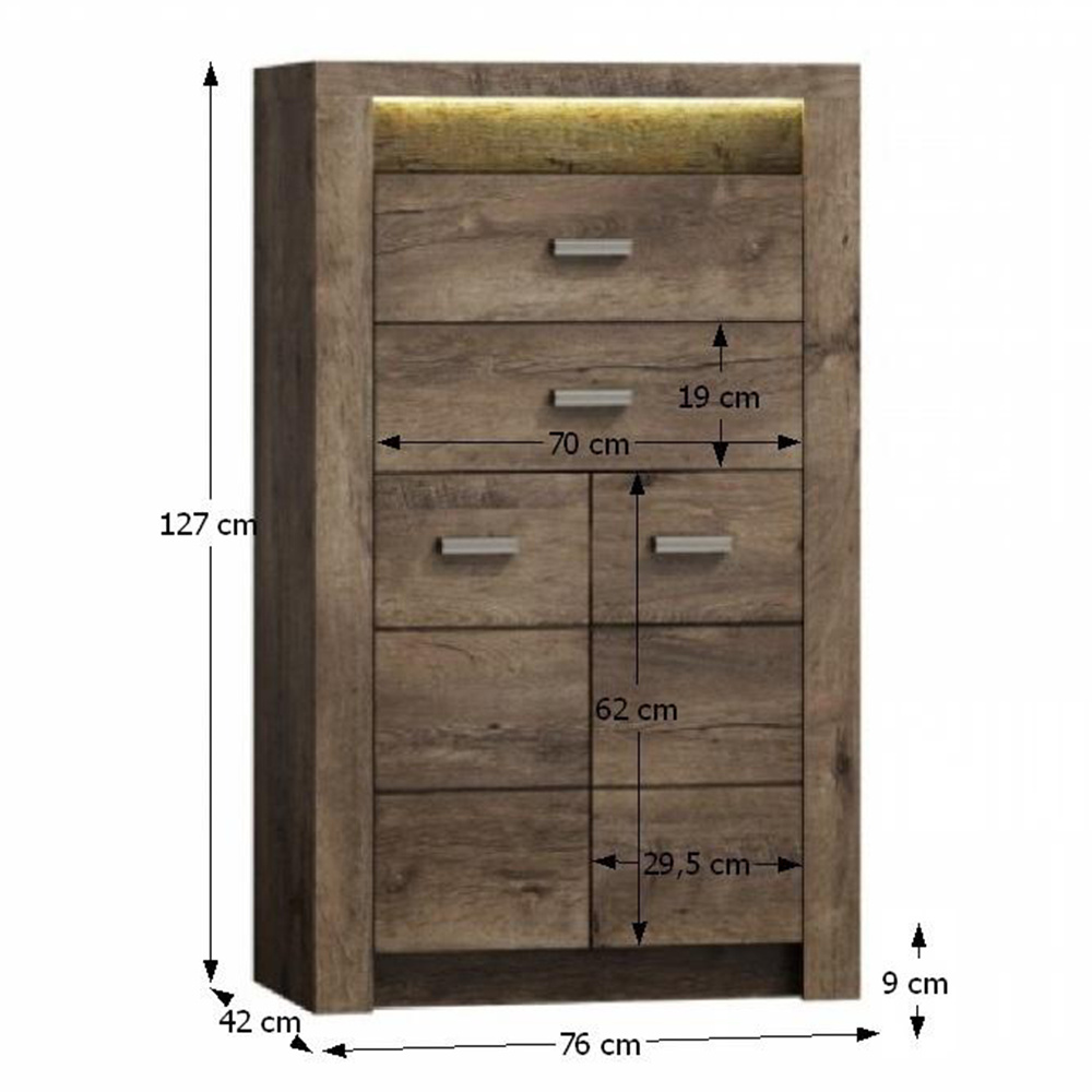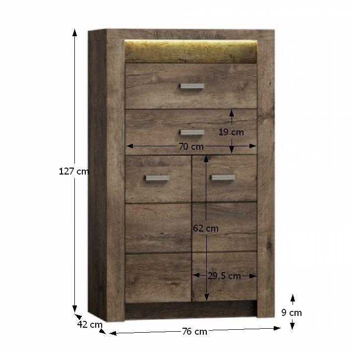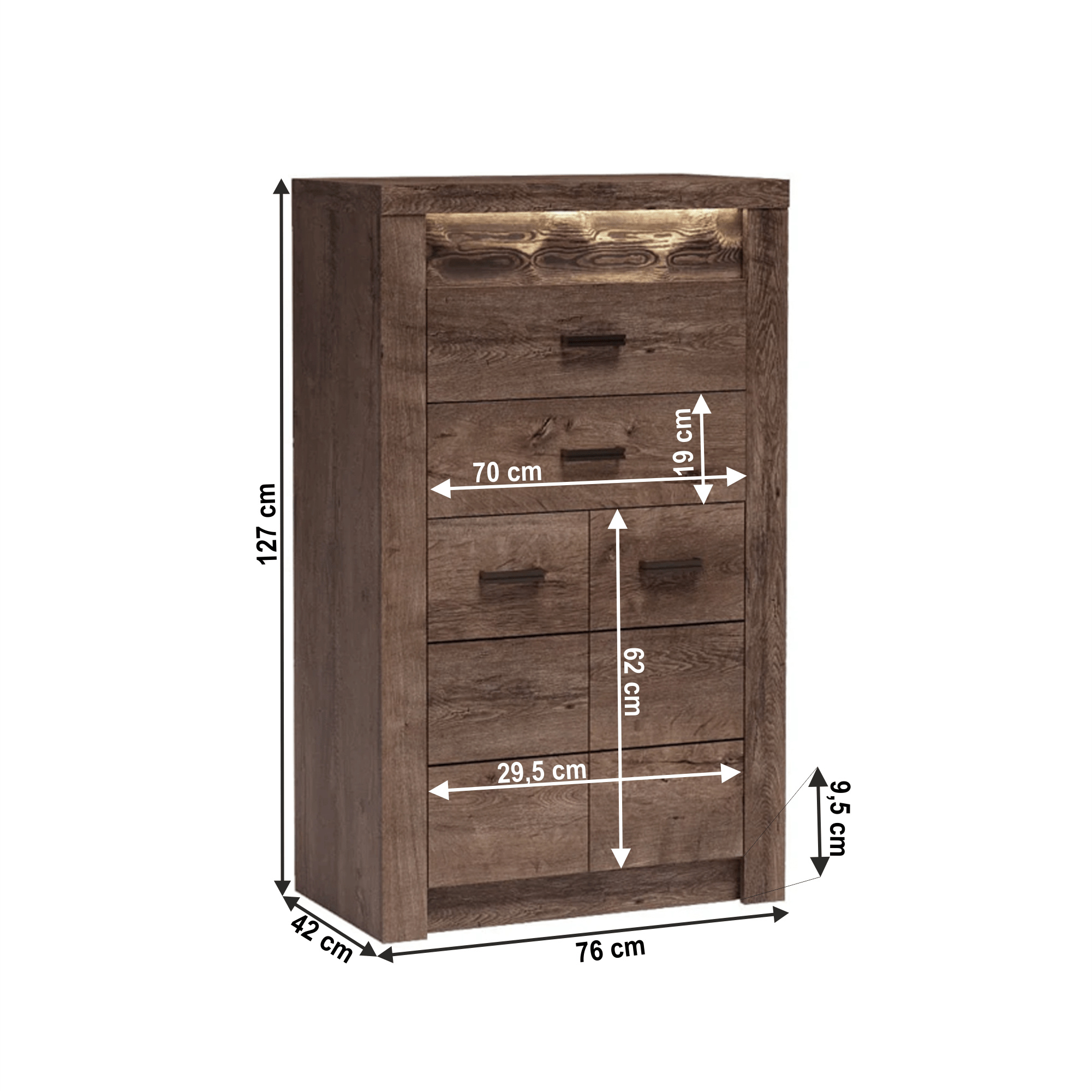 Komoda Infinity I-06 Korpus hrubý až 48 mm, Tloušťka materiálu zbývající části: 16 mm, úchytky kovové Materiál DTD laminovaná, ABS hrany, barevné provedení: jasan tmavý, Rozměry ŠxHxV: 76x42x127 cm. Možnost dokoupení LED osvětlení v ceně 840 Kč. Dodávané v demontu.