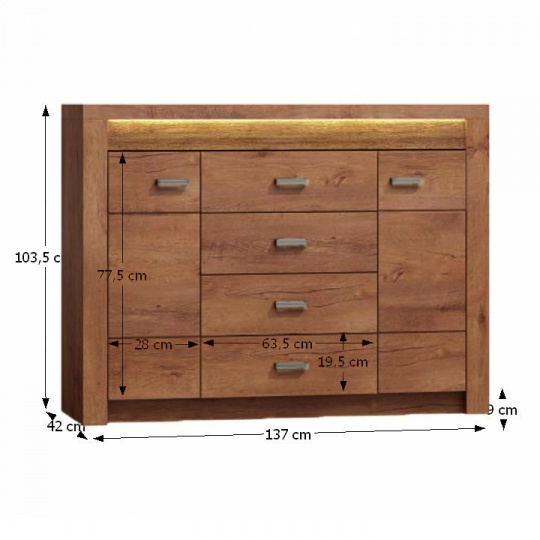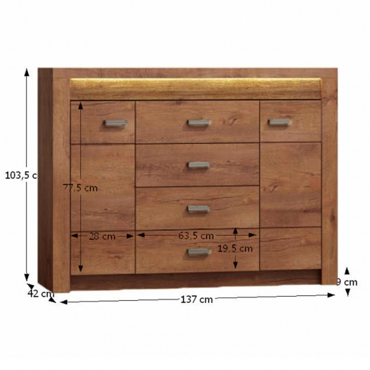 Komoda 07 z luxusního sektorového nábytku. Korpus hrubý až 48 mm, Tloušťka materiálu zbývající části: 16 mm, úchytky kovové Materiál DTD laminovaná, ABS hrany, Barevné provedení: jasan světlý, Rozměry ŠxHxV: 137x42x103,5 cm. Podsvícená deska z masivního dřeva Dodávané bez LED osvětlení Možnost dokoupení LED osvětlení v ceně 1090 Kč. Dodávané v demontu.