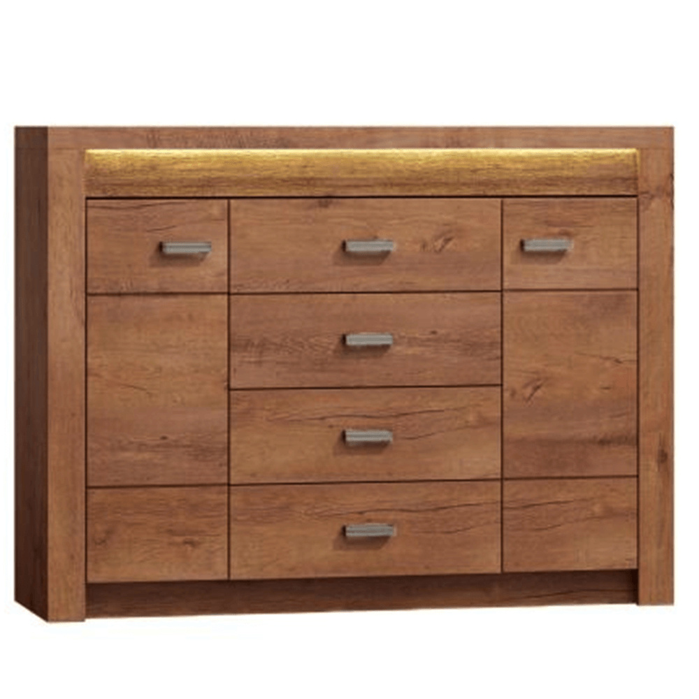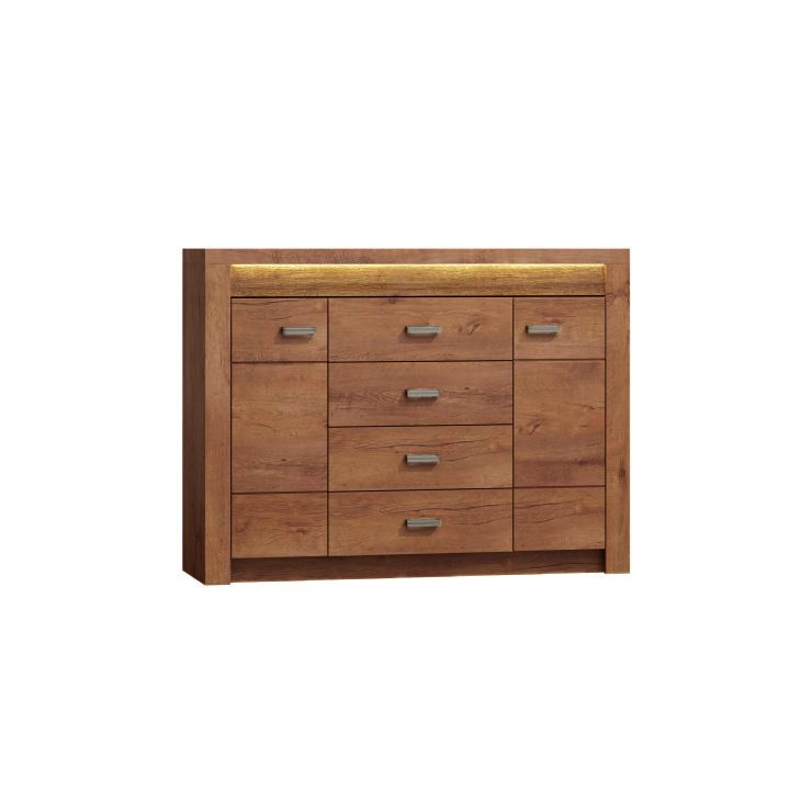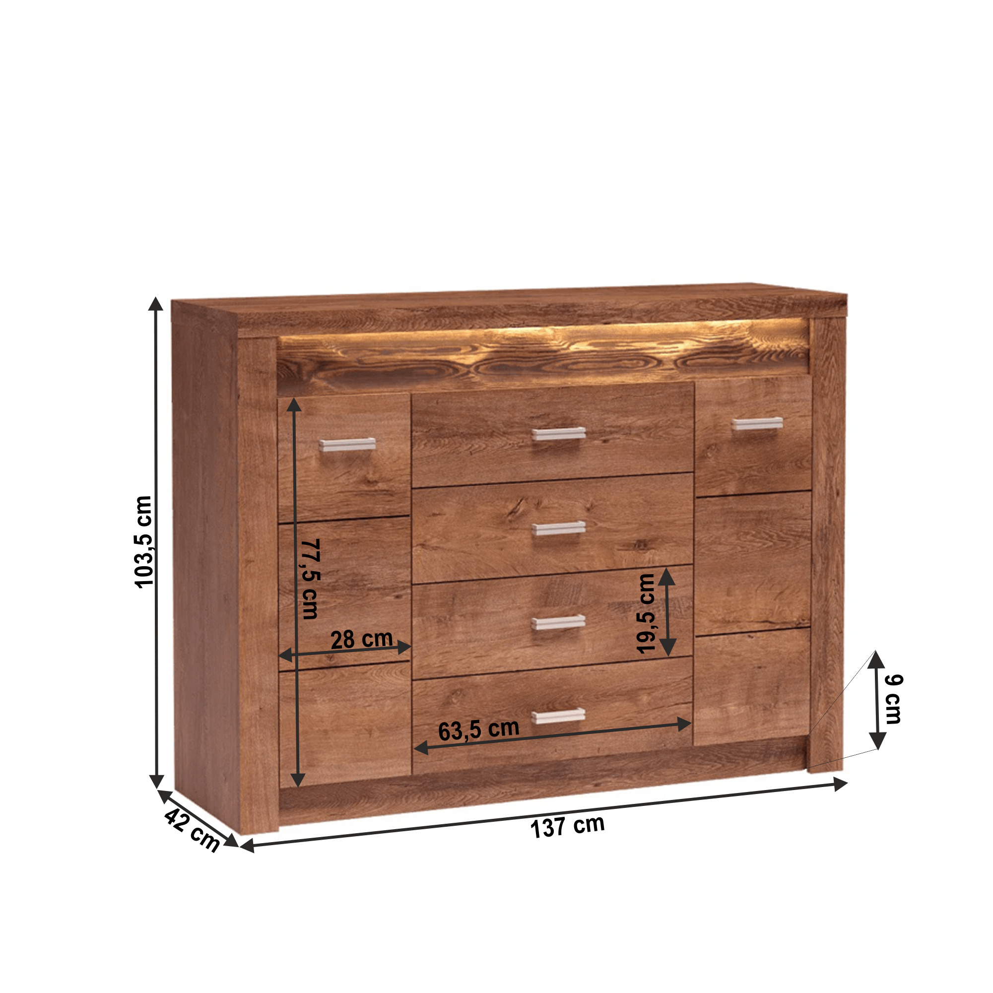 Komoda 07 z luxusního sektorového nábytku. Korpus hrubý až 48 mm, Tloušťka materiálu zbývající části: 16 mm, úchytky kovové Materiál DTD laminovaná, ABS hrany, Barevné provedení: jasan světlý, Rozměry ŠxHxV: 137x42x103,5 cm. Podsvícená deska z masivního dřeva Dodávané bez LED osvětlení Možnost dokoupení LED osvětlení v ceně 1090 Kč. Dodávané v demontu.