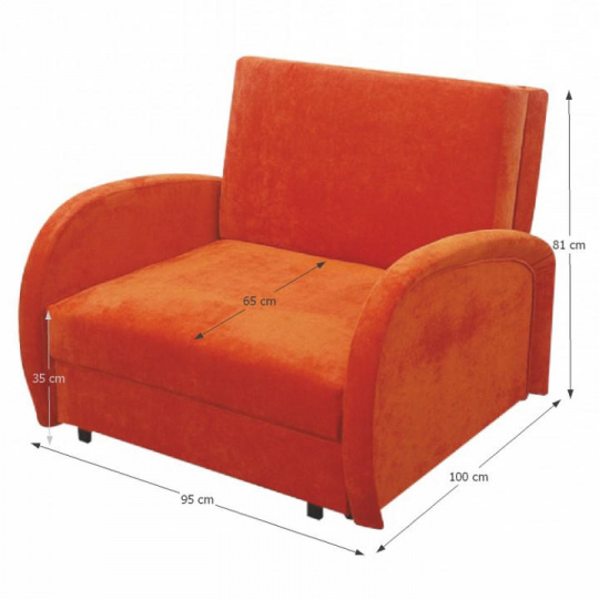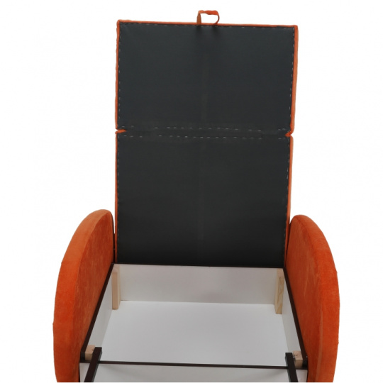 Rozkládací křeslo s úložným prostorem, MILI 1  Materiál: látka  Barva: šenil Laris 1602/16 oranžový  Oděruodolnost textilie podle testu Martindale: 80 000 oděrek  Rozměry (ŠxHxV): 95x100x81 cm  Plocha na spaní (ŠxH): 80x195 cm  Výška sedu: 35 cm  Hloubka sedu: 65 cm  Nosnost na osobu: 90 kg  Kvalitní molitanové sezení.  Dodávané v montu.  Možnost objednání v 6 barevných provedeních látky Matrix v ceně 7.850 Kč. Při individuální objednávce je třeba zaplatit 20% zálohu z dané částky. Po uhrazení zálohy bude Vaša objednávka zadána do výroby. Doba dodání 6-8 týdnů.
