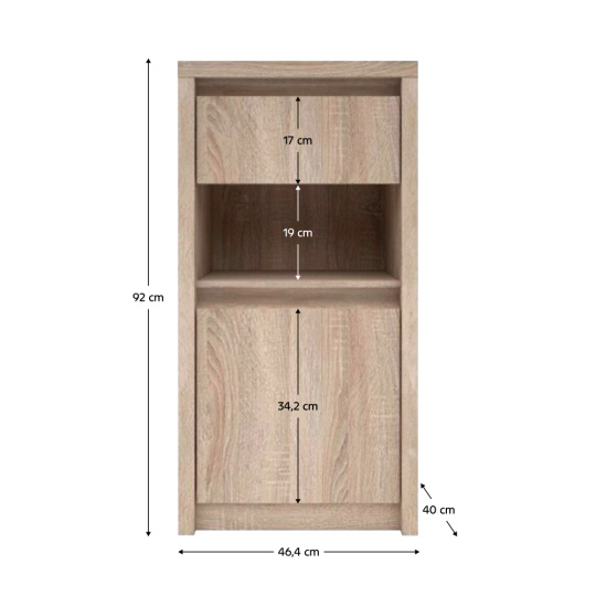 Materiál: DTD laminovaná Barva: dub sonoma Rozměry (ŠxHxV): 46,4x40x92 cm Tloušťka materiálu: 3,2 cm Tloušťka materiálu zbývající části: 1,6 cm Šuplík Výška šuplíku: 17 cm Otevřený úložný prostor Výška otevřeného úložného prostoru: 19 cm Jednodveřová skříňka Výška skříňky: 34,2 cm Doporučujeme připevnit ke zdi Dodáváno v demontu