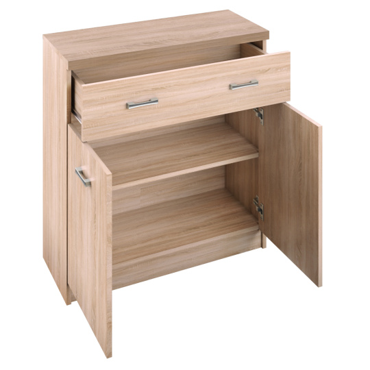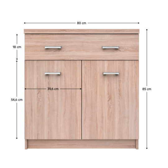 Komoda 2D1S TOPTY TYP 19 Materiál: DTD laminovaná Barva: dub sonoma Rozměry (ŠxHxV): 80x33x85 cm Rozměry dvířek (ŠxV): 39,6x54,6 cm Rozměry šuplíku (ŠxV): 80x18 cm 2-dveřová Se šuplíkem Policová Dodáváno v demontu.