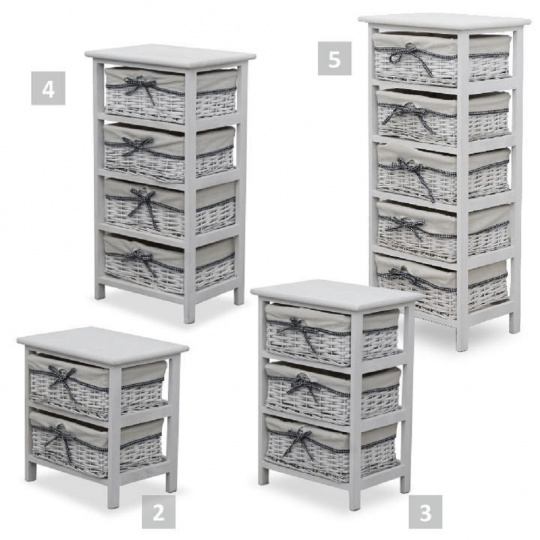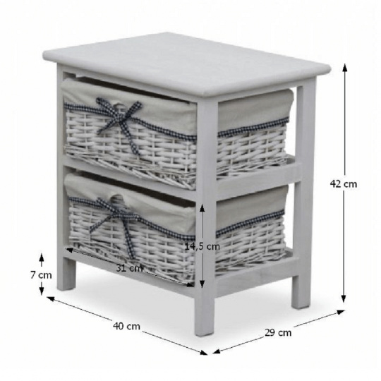 komoda (případně noční stolek) s pevným rámem a 2 proutěnými košíky, materiál dřevo / proutí, kombinace starobílé barvy, rozměry (ŠxVxH) 40x42x29 cm.