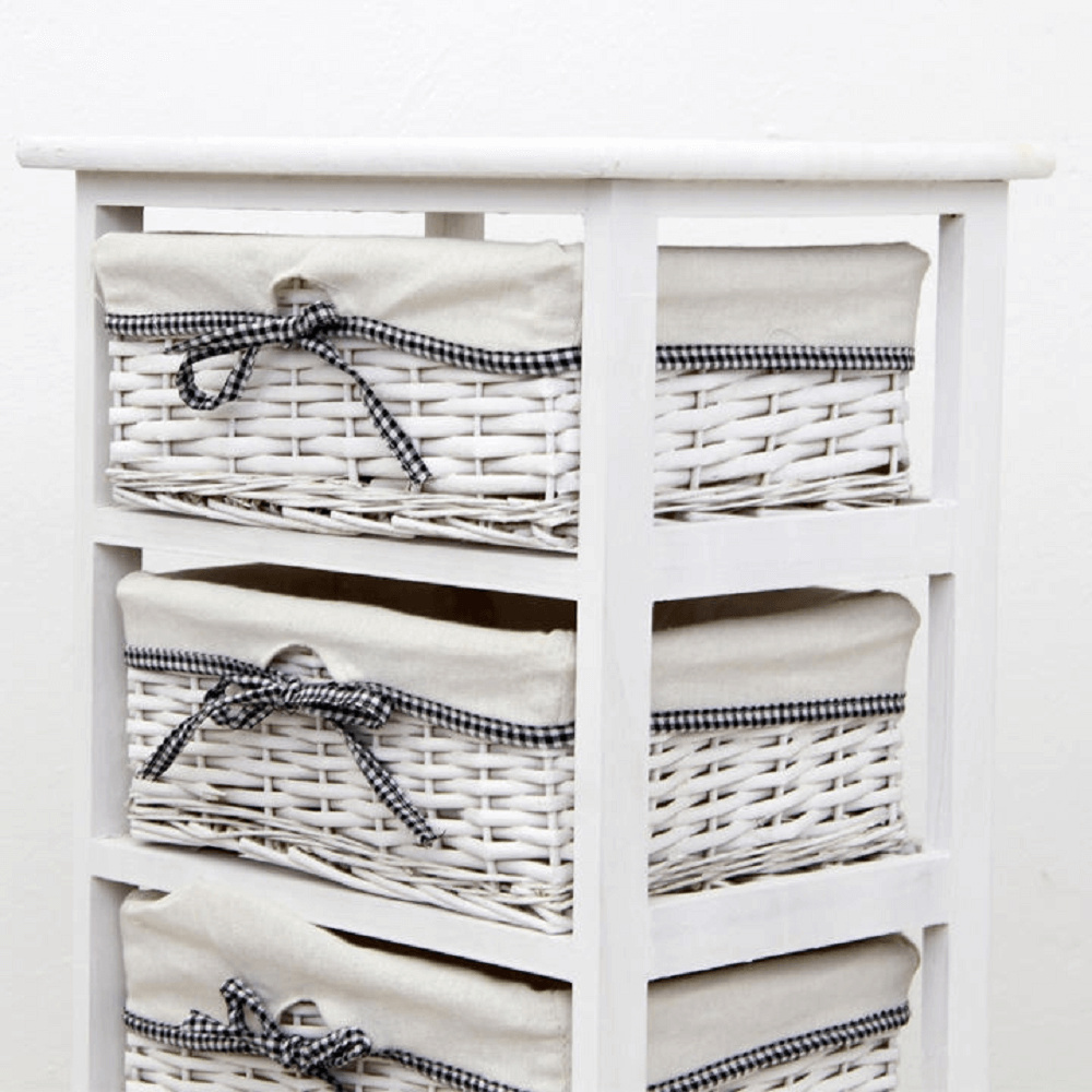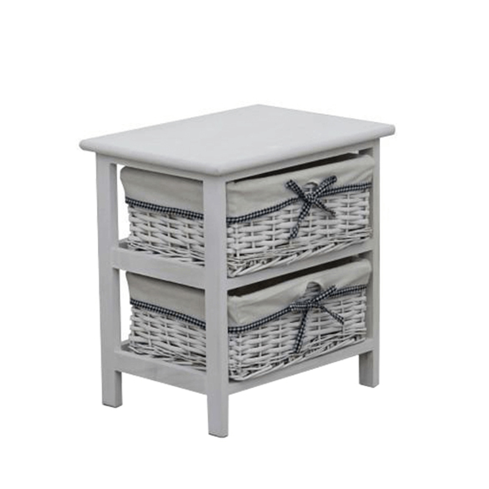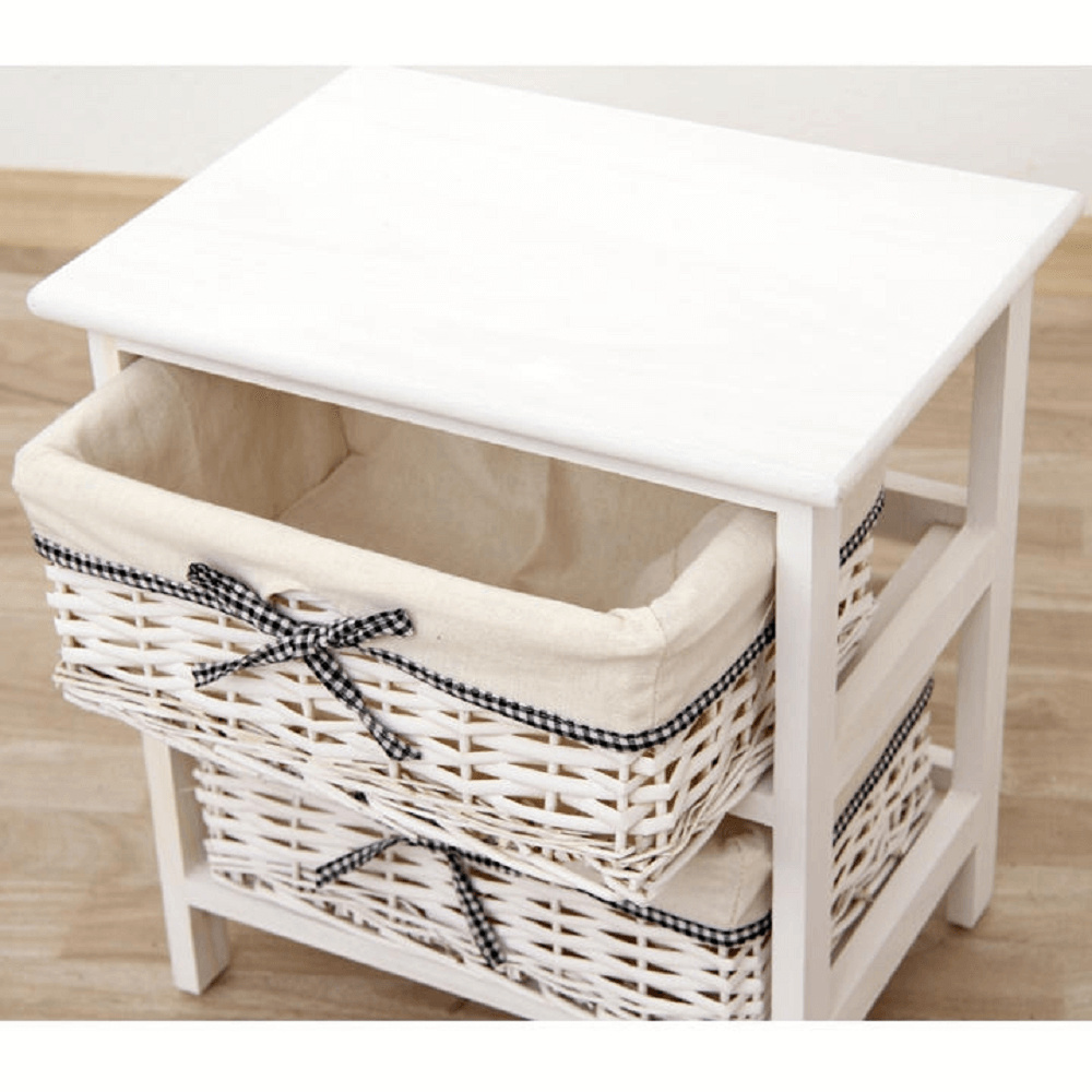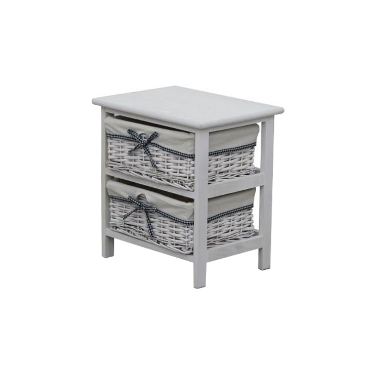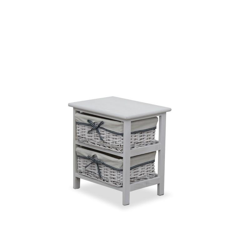 komoda (případně noční stolek) s pevným rámem a 2 proutěnými košíky, materiál dřevo / proutí, kombinace starobílé barvy, rozměry (ŠxVxH) 40x42x29 cm.