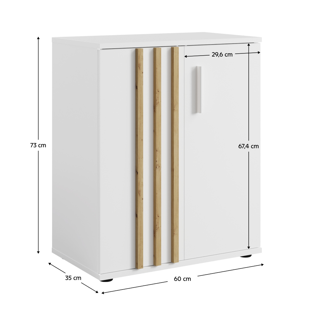 Materiál: DTD laminovaná/MDF Barva: bílá/dub artisan Rozměry (ŠxHxV): 60x35x73 cm Tloušťka materiálu: 1,6 cm Tloušťka lamely: 1,6 cm Šířka lamely: 1,8 cm Dvoudveřová S policí Nosnost police: 5 kg Nosnost odkládací plochy: 10 kg Úchytka jen na jedné straně dveří Materiál úchytu: MDF Barva úchytky: bílá Dodáváno s ozdobnými lamelami Moderní styl Dodáváno v demontu