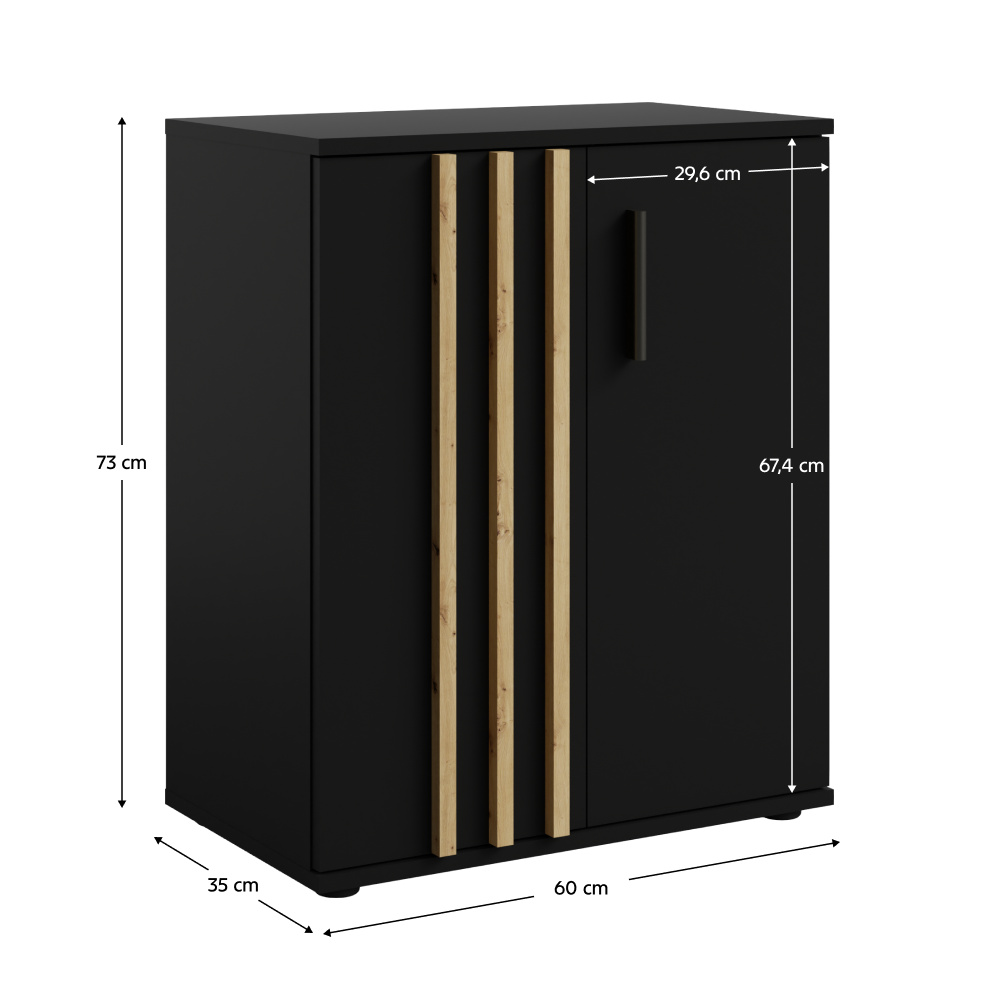 Materiál: DTD laminovaná/MDF Barva: černá/dub artisan Rozměry (ŠxHxV): 60x35x73 cm Tloušťka materiálu: 1,6 cm Tloušťka lamely: 1,6 cm Šířka lamely: 1,8 cm Dvoudveřová S policí Nosnost police: 5 kg Nosnost odkládací plochy: 10 kg Úchytka jen na jedné straně dveří Materiál úchytu: MDF Barva úchytky: černá Dodáváno s ozdobnými lamelami Moderní styl Dodáváno v demontu