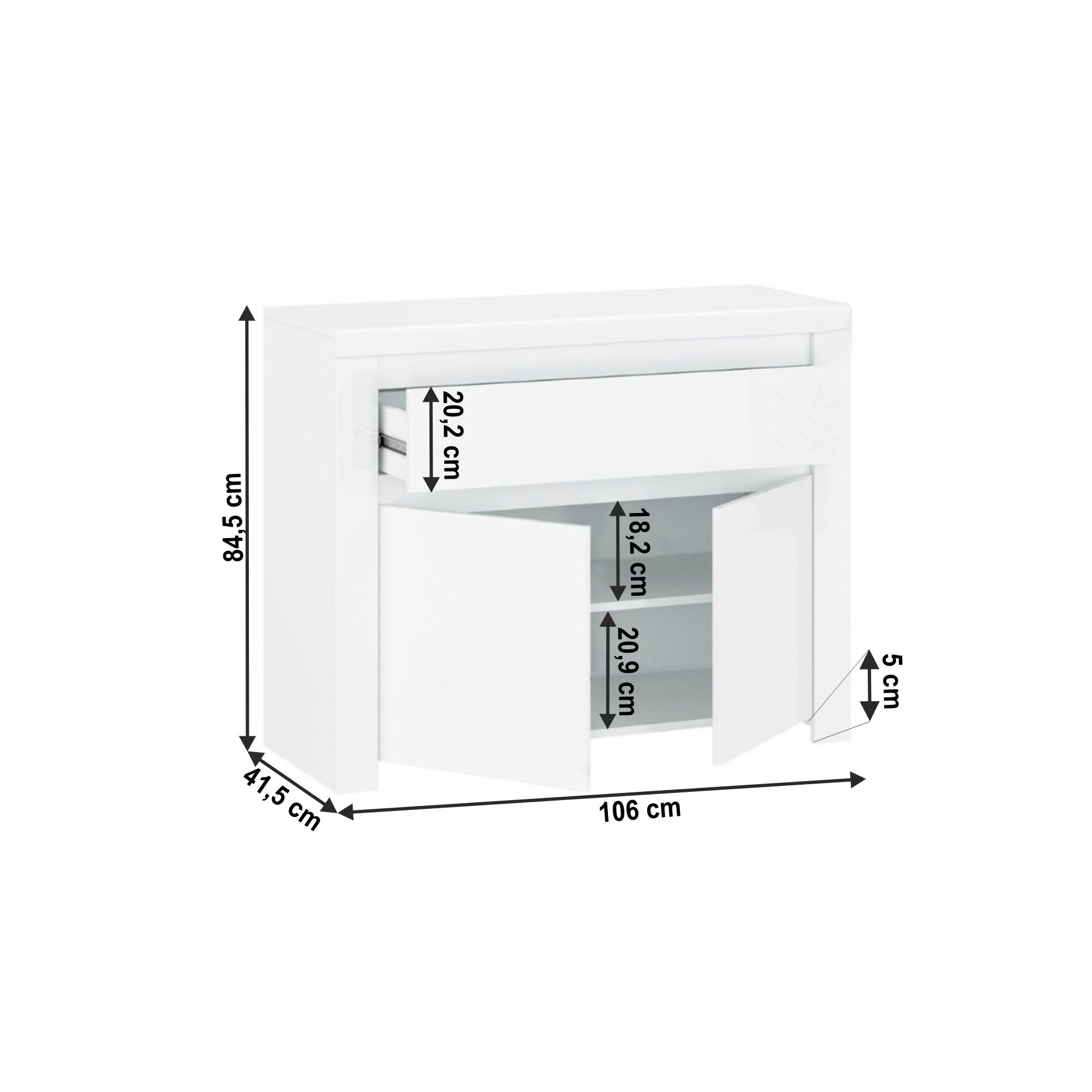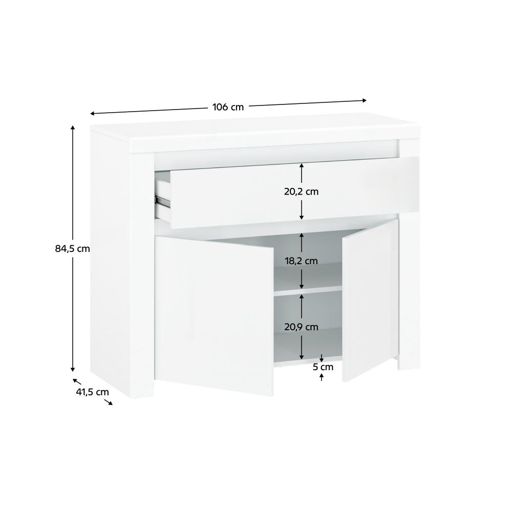 Materiál: laminovaná DTD / MDF / ABS hrany Barva: bílý lesk Rozměry (ŠxHxV): 106x41,5x84,5 cm Tloušťka materiálu: 1,6 cm Obsahuje jednu zásuvku a skříňku 1 police Dvířka bez úchytek Korpus z DTD Dvířka / fronty z MDF ABS hrany moderní design Dodávané v demontu