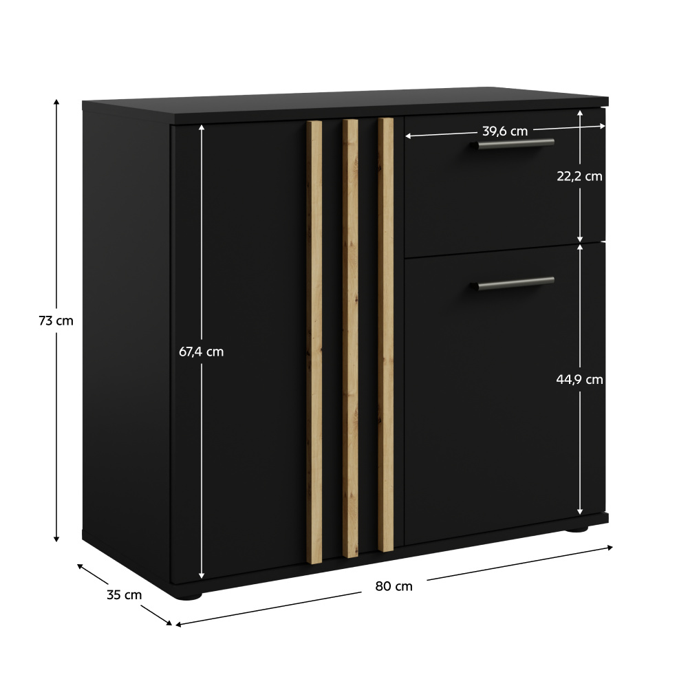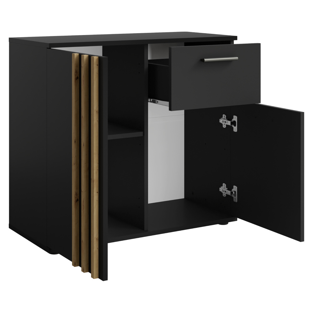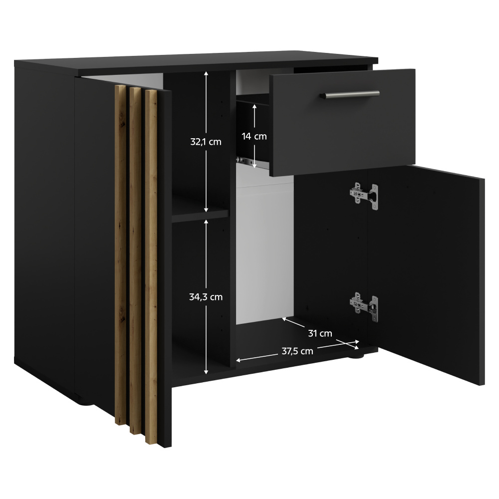 Materiál: DTD laminovaná/MDF Barva: černá/dub artisan Rozměry (ŠxHxV): 80x35x73 cm Tloušťka materiálu: 1,6 cm Tloušťka lamely: 1,6 cm Šířka lamely: 1,8 cm Dvoudveřová S policí Nosnost police: 5 kg Se šuplíkem Nosnost šuplíku: 5 kg Nosnost odkládací plochy: 10 kg Úchytka jen na jedné straně dveří Materiál úchytu: MDF Barva úchytky: černá Dodáváno s ozdobnými lamelami Moderní styl Dodáváno v demontu