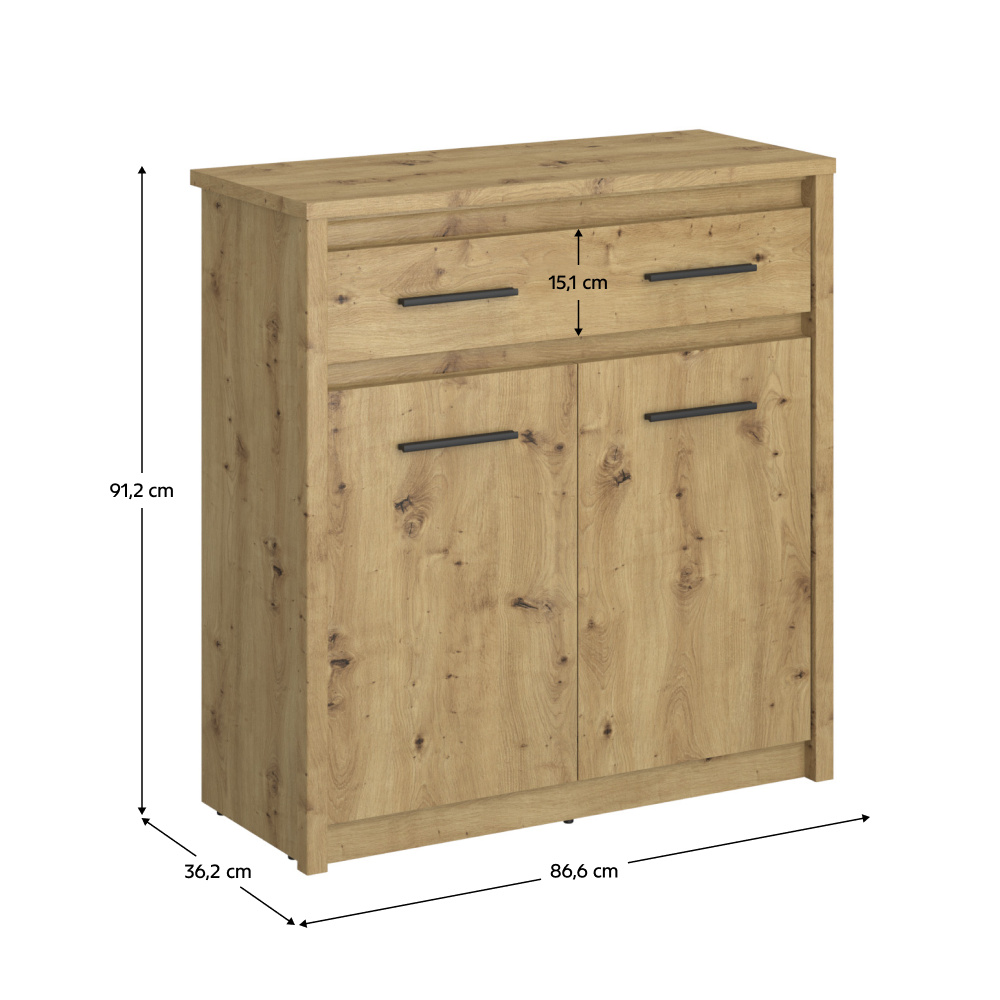 Materiál: DTD laminovaná/ABS hrany Barva: dub artisan Rozměry (ŠxHxV): 86,6x36,2x91,2 cm Tloušťka materiálu: 1,6-3,2 cm Plastové úchytky Barva úchytek: černá Šuplík Výška šuplíku: 15,1 cm Police Nosnost police: 5 kg Dvoudveřová skříňka Plastové nožičky Moderní design Doporučujeme připevnit ke zdi Dodáváno v demontu