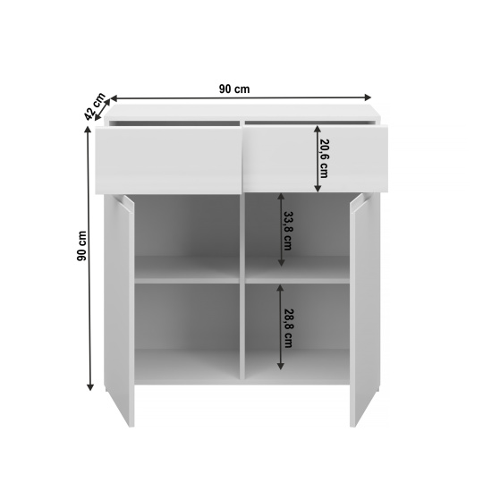 Materiál korpus: DTD laminovaná Barva: bílá Materiál dvířka: MDF Barva: bílý extra vysoký lesk HG Rozměry (ŠxHxV): 90x42x90 cm Tloušťka materiálu korpus: 1,6 cm Tloušťka materiálu dvířka: 1,8 cm Množství úložného prostoru dva šuplíky dvoudveřová moderní styl Dodávané v demontu
