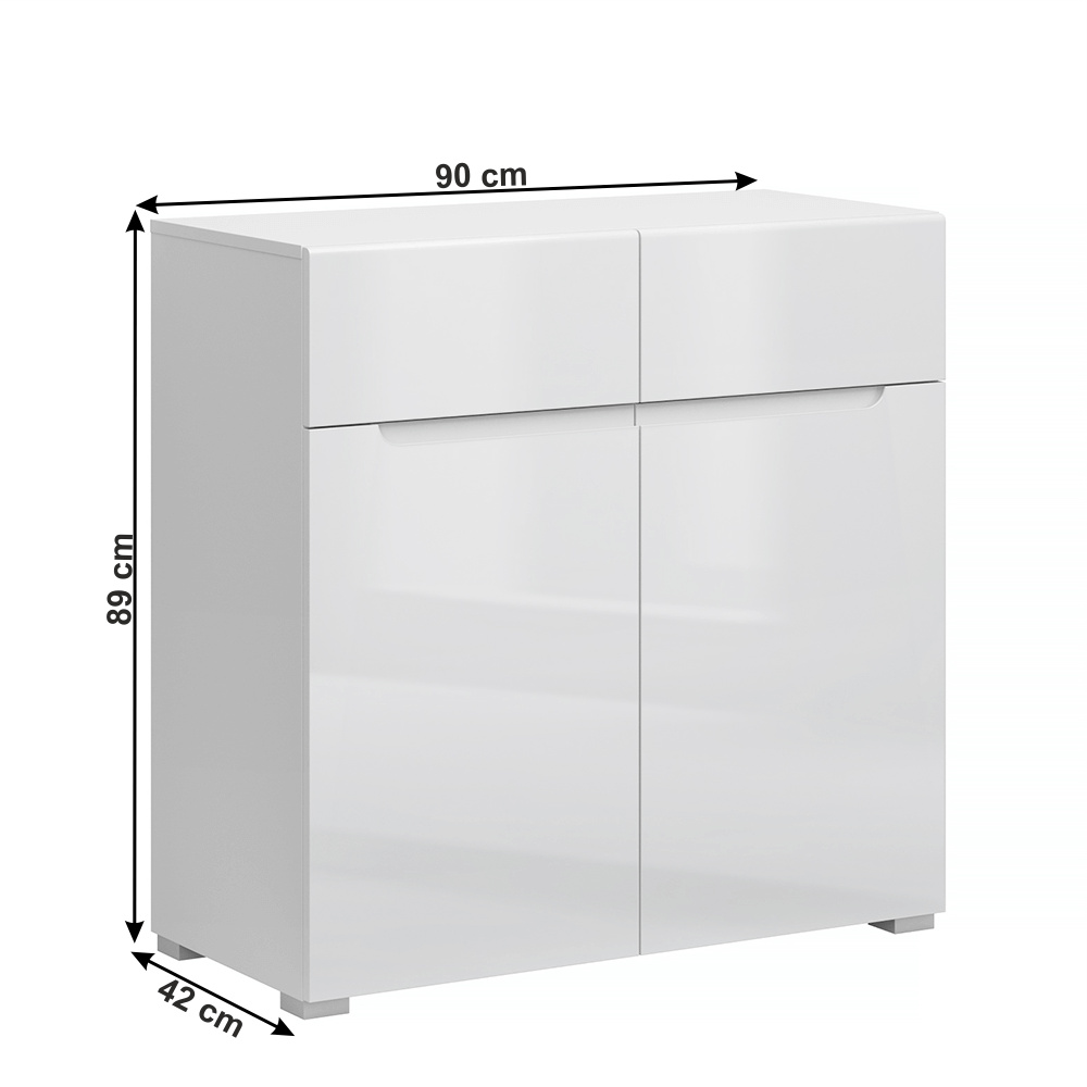 Materiál korpus: DTD laminovaná Barva: bílá Materiál dvířka: MDF Barva: bílý extra vysoký lesk HG Rozměry (ŠxHxV): 90x42x90 cm Tloušťka materiálu korpus: 1,6 cm Tloušťka materiálu dvířka: 1,8 cm Množství úložného prostoru dva šuplíky dvoudveřová moderní styl Dodávané v demontu