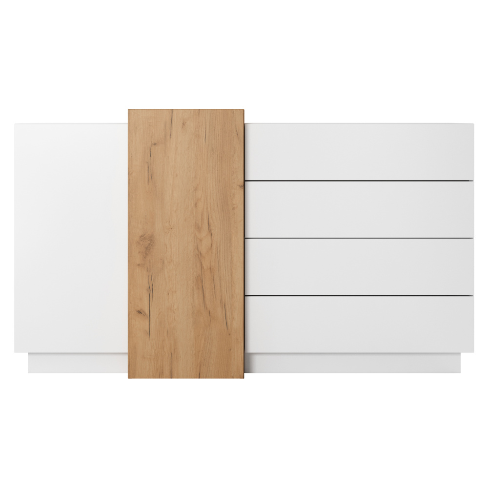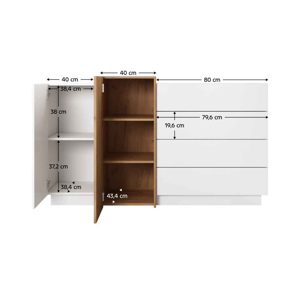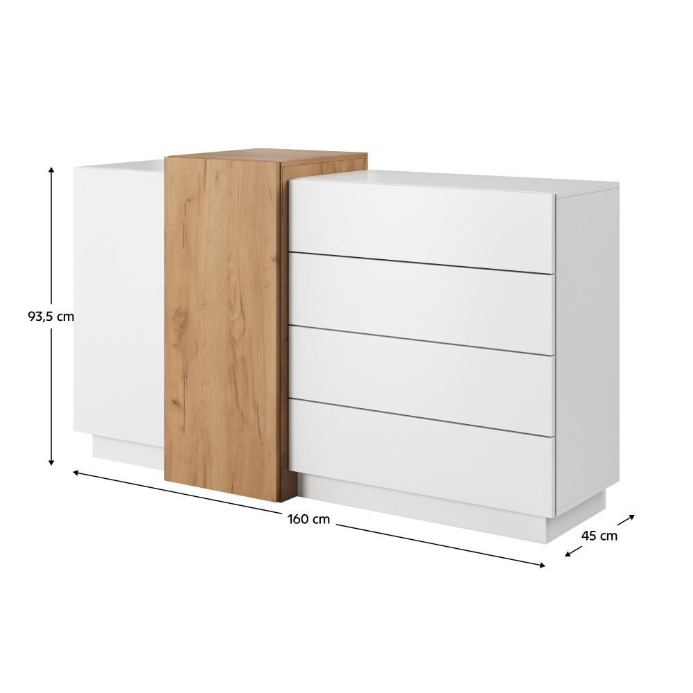Materiál: DTD laminovaná / ABS hrany Barva: bílá / dub craft zlatý Rozměry (ŠxHxV): 160x45x93,5 cm Hloubka užší skříňky a šuplíkové části: 40,4 cm Výška užší skříňky a šuplíkové části: 88,5 cm Šířka skříněk: 40 cm Šířka šuplíkové části: 80 cm Rozměry šuplíku (ŠxHxV): 79,6x33,4x19,6 cm dvoudveřová čtyři šuplíky S dotykovým systémem PUSH UP designová Dodávané v demontu