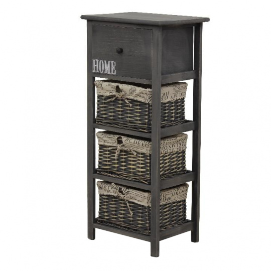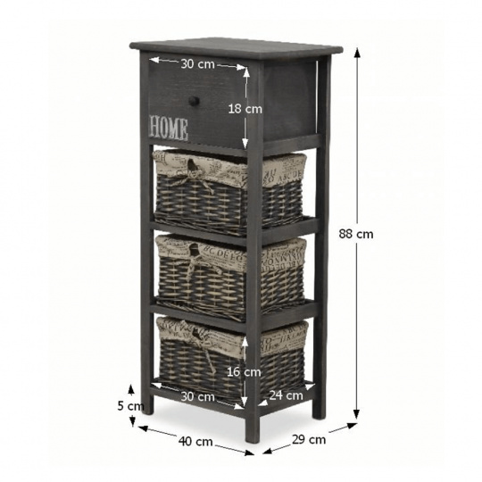 komoda s pevným rámem, s funkční zásuvkou a 3 proutěnými košíky, materiál: dřevo / proutí, barevné provedení: tmavě hnědá, ŠxVxH: 40x88x29 cm.