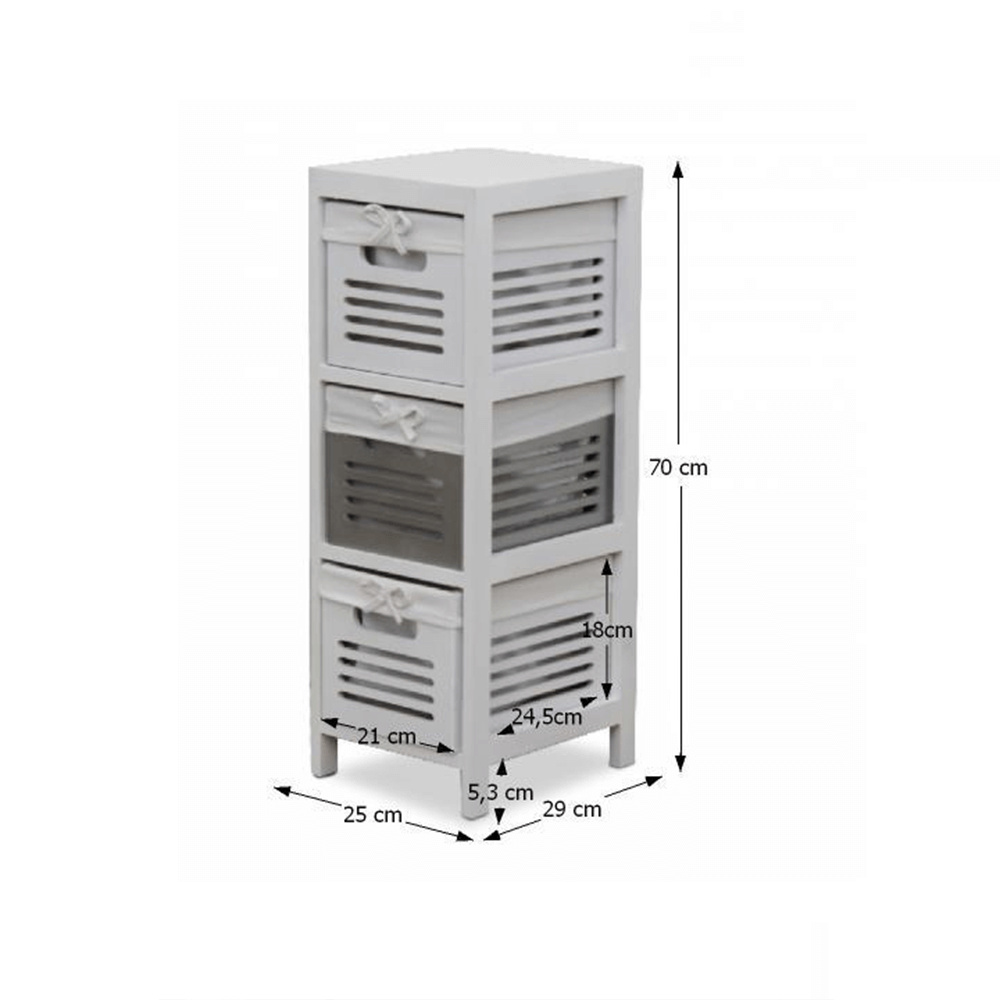 3 zásuvková bílá komoda s pevným rámem, Materiál: dřevo Barva: bílá / šedá Rozměry (ŠxHxV): 25x29x70 cm Hmotnost: 5,7 kg Dodávané v montu.