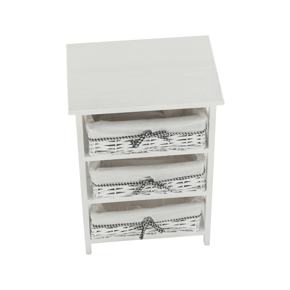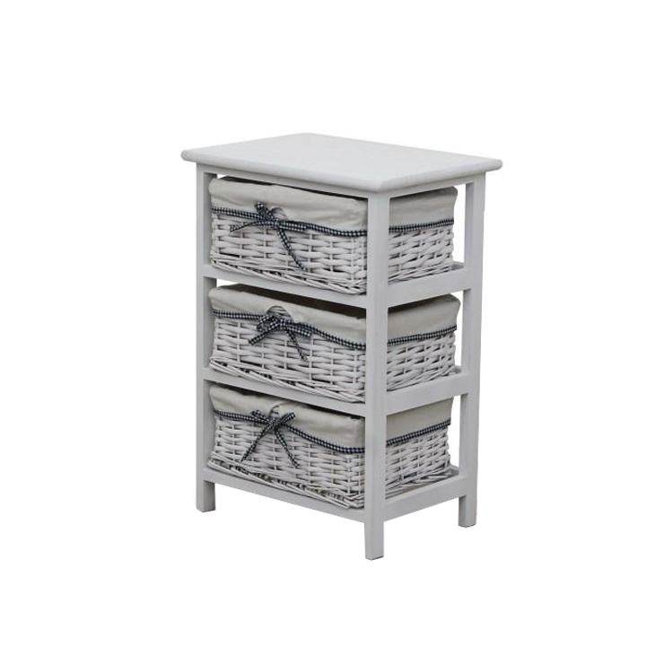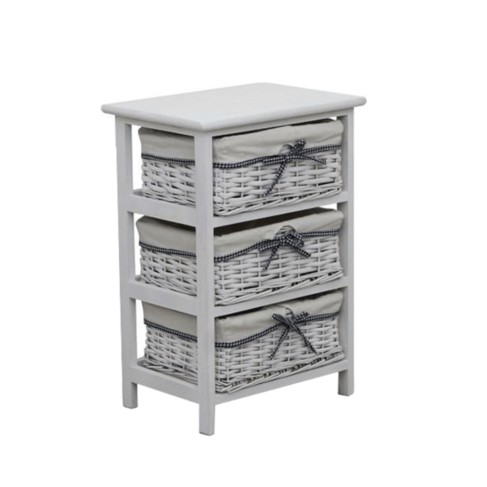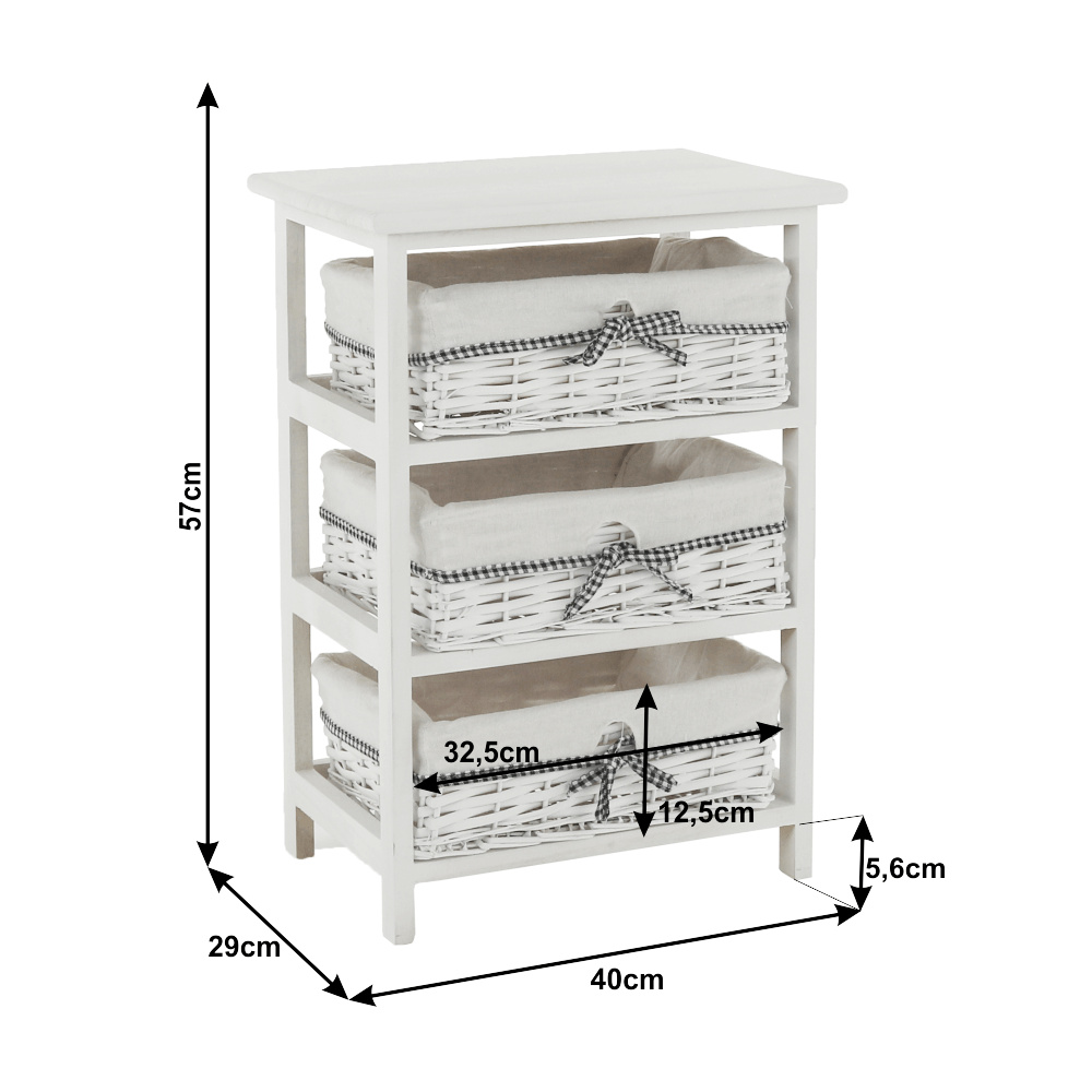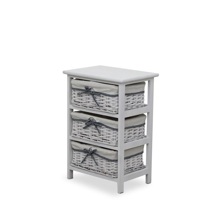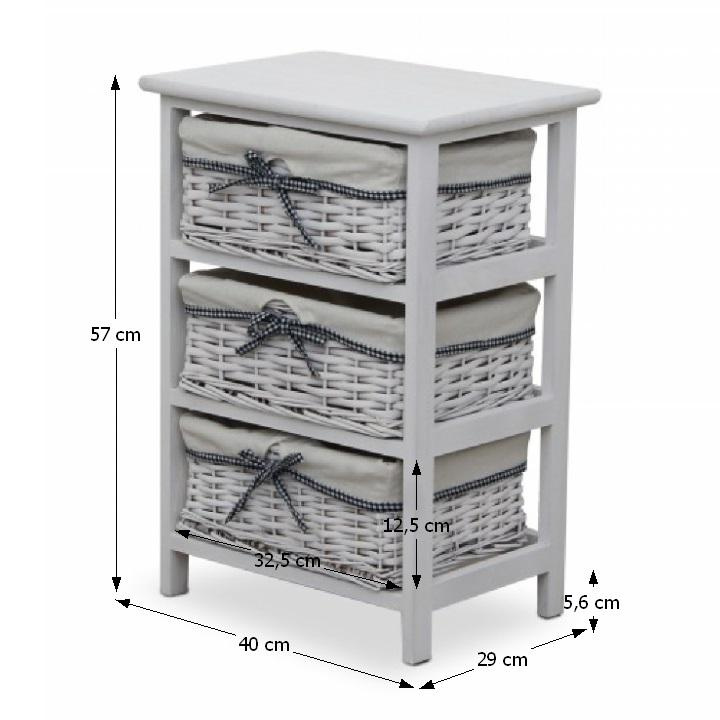 komoda s pevným rámem a 3 proutěnými košíky, materiál dřevo / proutí, kombinace starobílé barvy, rozměry (ŠxVxH) 40x57x29 cm.