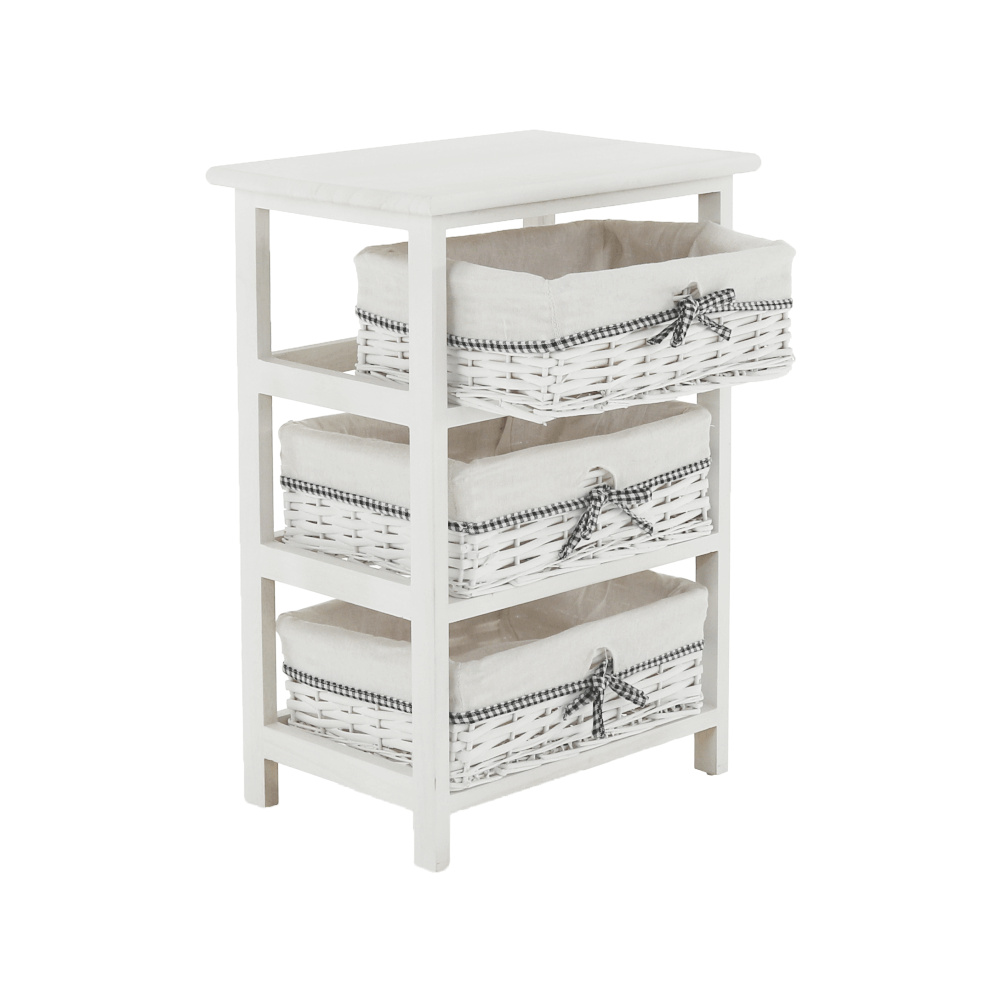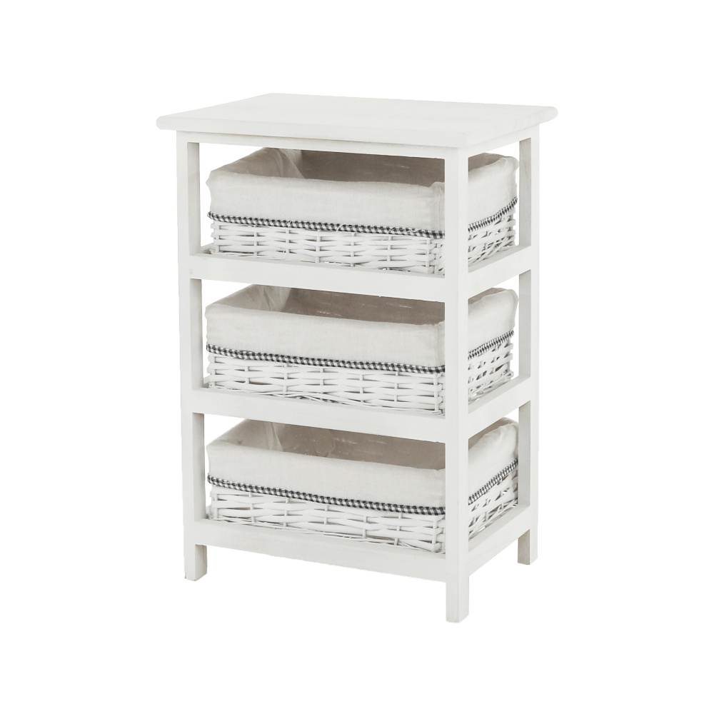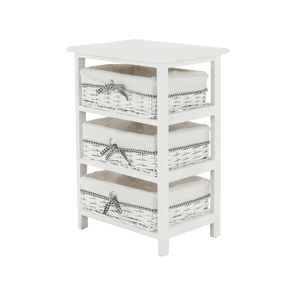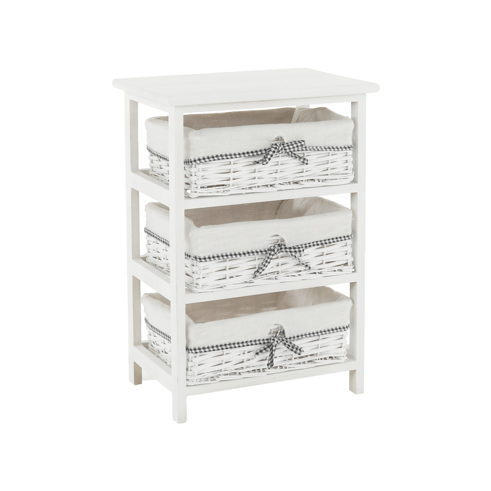 komoda s pevným rámem a 3 proutěnými košíky, materiál dřevo / proutí, kombinace starobílé barvy, rozměry (ŠxVxH) 40x57x29 cm.