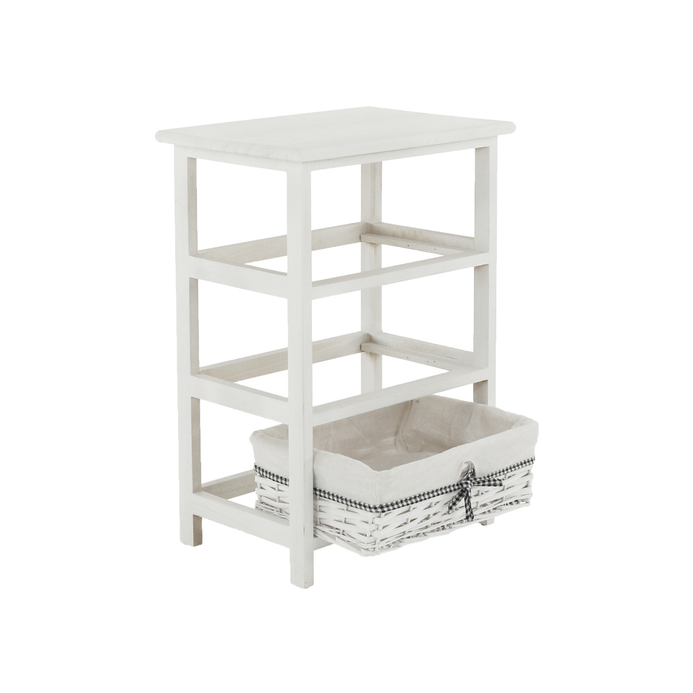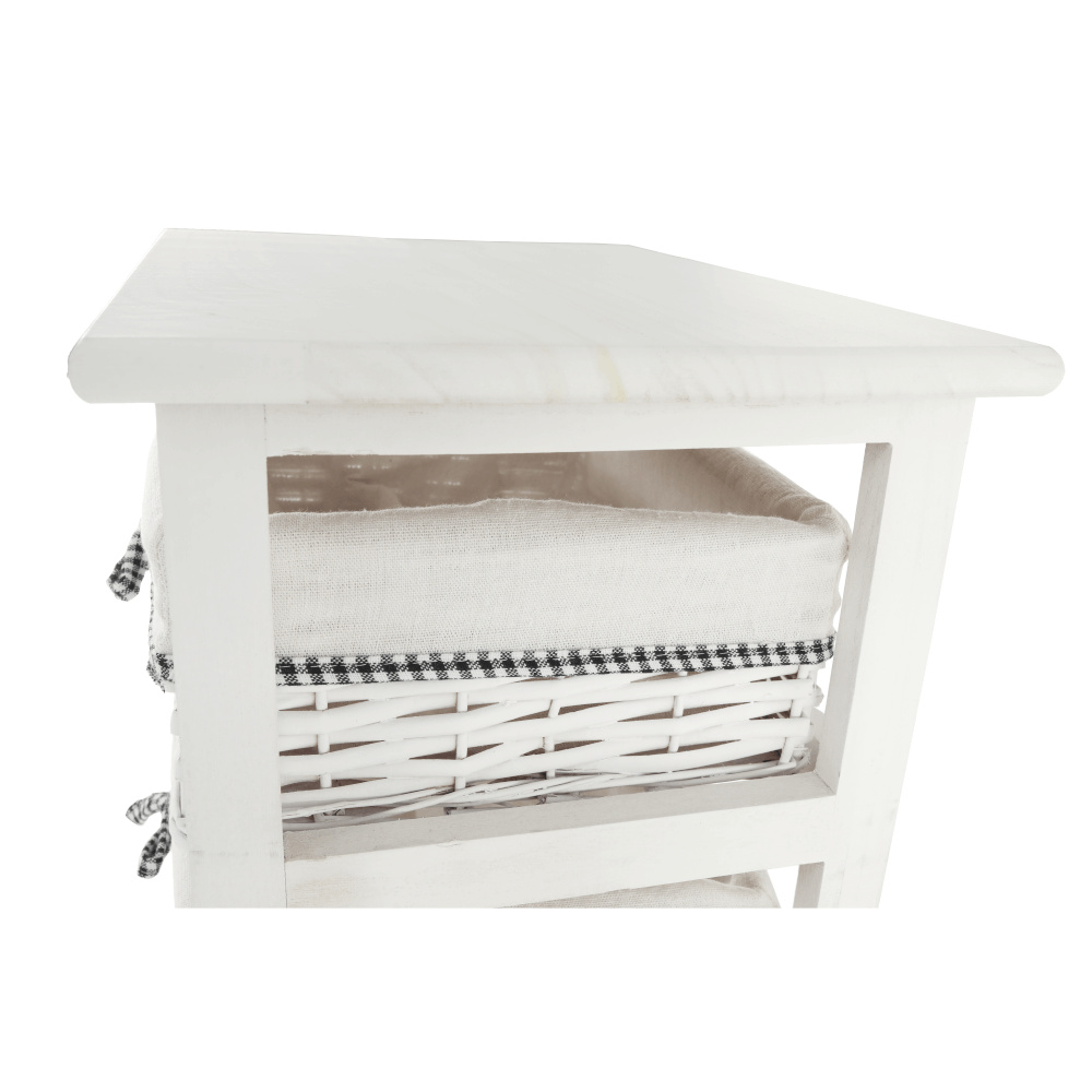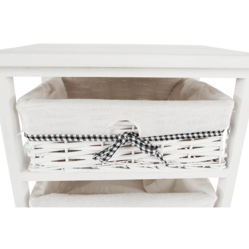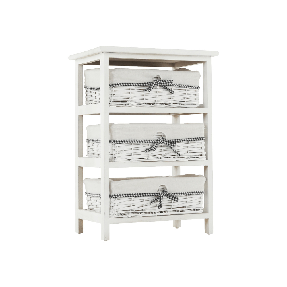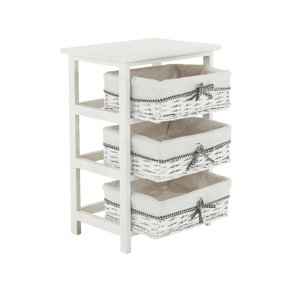 komoda s pevným rámem a 3 proutěnými košíky, materiál dřevo / proutí, kombinace starobílé barvy, rozměry (ŠxVxH) 40x57x29 cm.