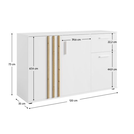 Materiál: DTD laminovaná/MDF Barva: bílá/dub artisan Rozměry (ŠxHxV): 120x35x73 cm Tloušťka materiálu: 1,6 cm Tloušťka lamely: 1,6 cm Šířka lamely: 1,8 cm Třídveřová S policí Nosnost police: 5 kg Se šuplíkem Nosnost šuplíku: 5 kg Nosnost odkládací plochy: 10 kg Úchytka jen na jedné straně dveří Materiál úchytu: MDF Barva úchytky: bílá Dodáváno s ozdobnými lamelami Moderní styl Dodáváno v demontu