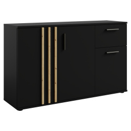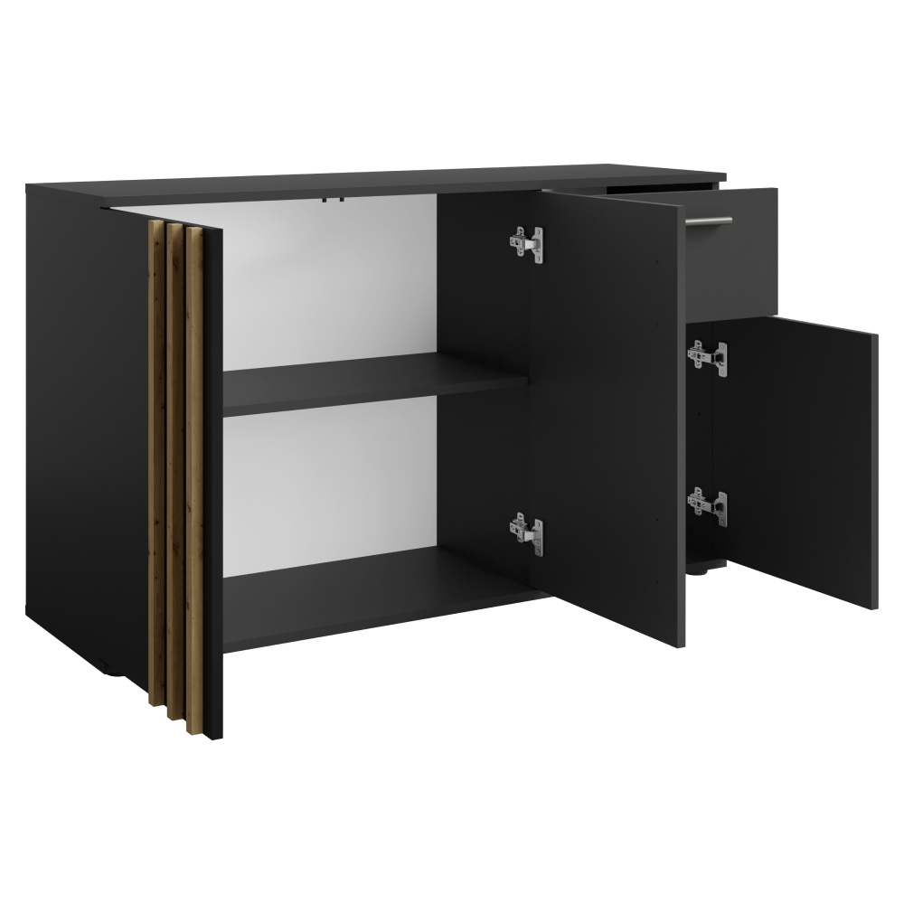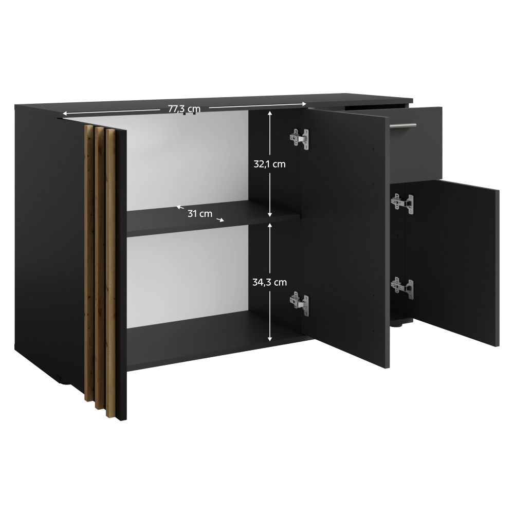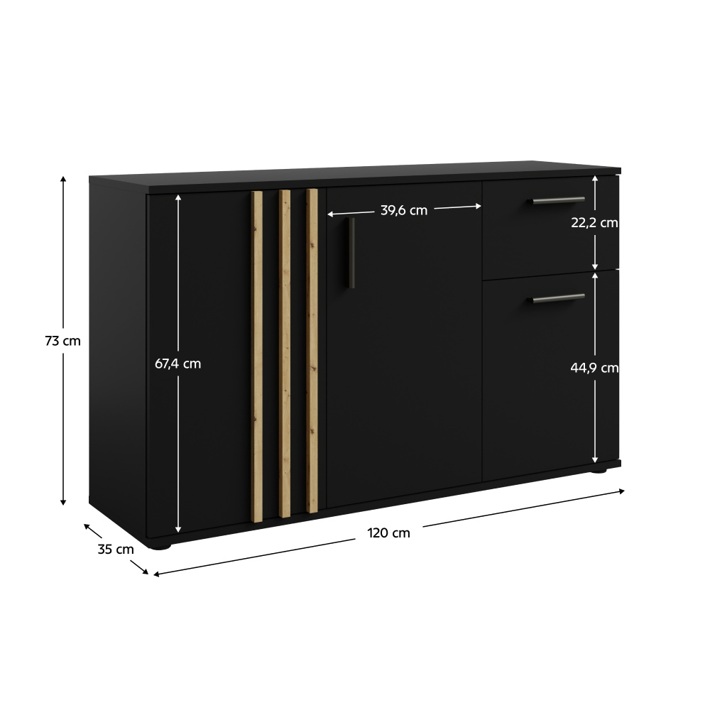 Materiál: DTD laminovaná/MDF Barva: černá/dub artisan Rozměry (ŠxHxV): 120x35x73 cm Tloušťka materiálu: 1,6 cm Tloušťka lamely: 1,6 cm Šířka lamely: 1,8 cm Třídveřová S policí Nosnost police: 5 kg Se šuplíkem Nosnost šuplíku: 5 kg Nosnost odkládací plochy: 10 kg Úchytka pouze na jedné straně dveří Materiál úchytu: MDF Barva úchytky: černá Dodáváno s ozdobnými lamelami Moderní styl Dodáváno v demontu