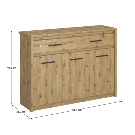 Materiál: DTD laminovaná/ABS hrany Barva: dub artisan Rozměry (ŠxHxV): 125,4x36,2x91,2 cm Tloušťka materiálu: 1,6-3,2 cm Plastové úchytky Barva úchytek: černá Třídveřová Dva šuplíky Nosnost šuplíku: 5 kg Výška šuplíku: 15,1 cm Plastové nožičky Moderní design Doporučujeme připevnit ke zdi Dodáváno v demontu