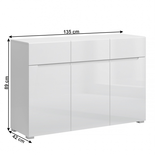 Materiál korpus: DTD laminovaná Barva: bílá Materiál dvířka: MDF Barva: bílý extra vysoký lesk HG Rozměry (ŠxHxV): 135x42x89 cm Tloušťka materiálu korpus: 16 cm Tloušťka materiálu dvířka: 18 cm bílý korpus tři šuplíky třídveřová moderní styl Dodávané v demontu