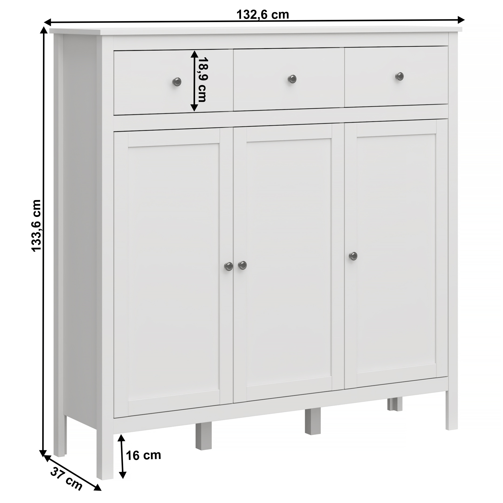 Materiál: DTD laminovaná/ABS hrany/MDF Farba: biela Rozmery (ŠxHxV): 132,6x37x133,6 cm Výška nožičiek: 16 cm Hrúbka materiálu: 1,6 cm Kombinovaná Tri šuplíky Výška šuplíka: 18,9 cm Tri skrinky V skrinke sú police MDF dvierka Dodávaná v demonte