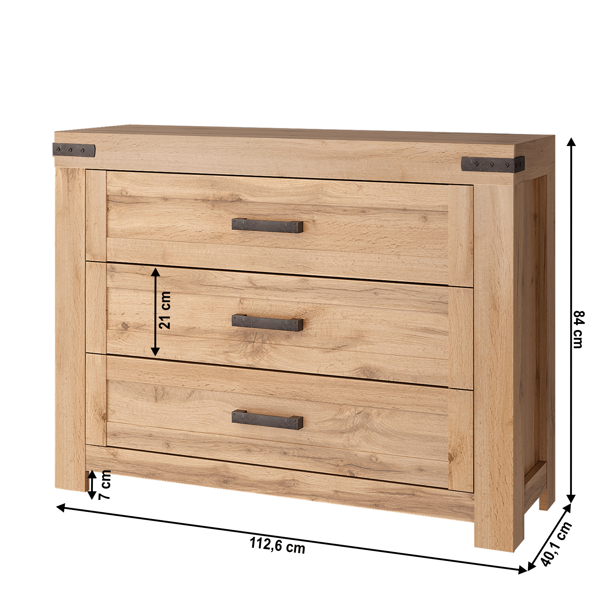 Komoda MORATIZ 3S Materiál: DTD laminovaná/MDF/plast Barva: dub wotan Rozměry (ŠxHxV): 112,6x40,1x84 cm Výška nožiček 7 cm Tloušťka materiálu: 1,6 - 2,2 cm Tři šuplíky Výška šuplíků: 21 cm Plastový dekor a úchytky MDF dvířka Dodávána v demontu