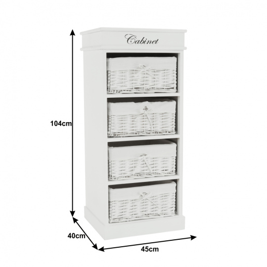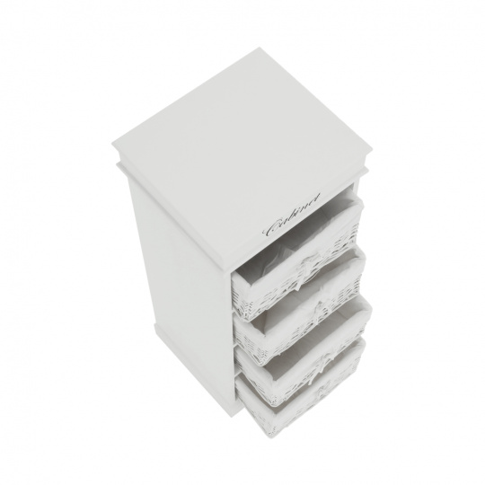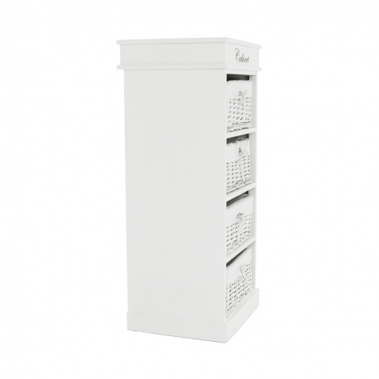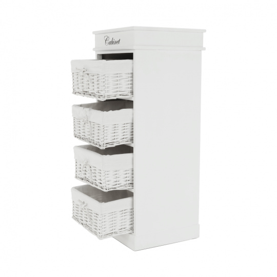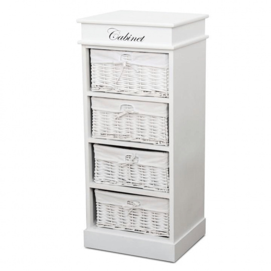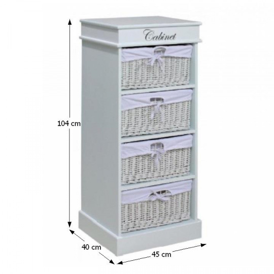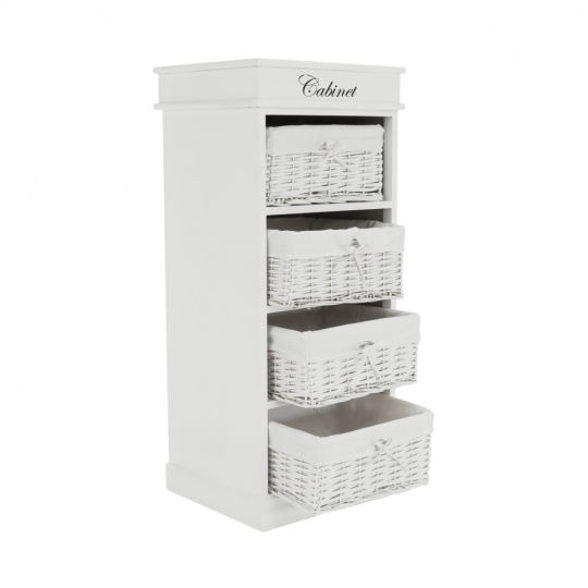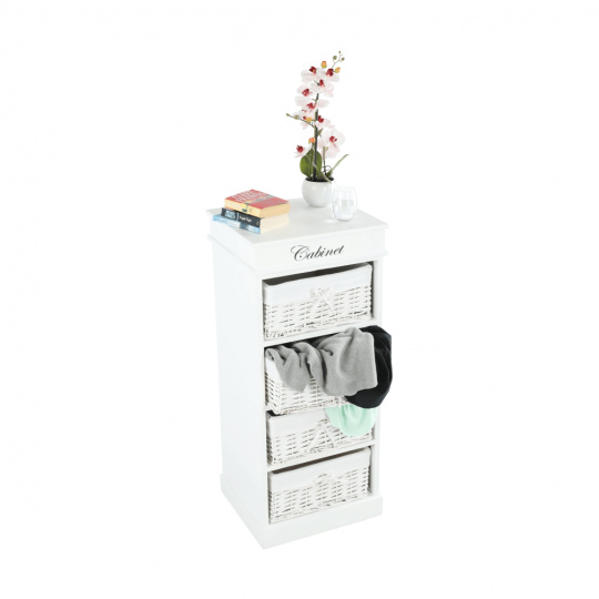 4- šuplíková komoda BLANCO materiál: dřevo / proutí / látka barevné provedení: bílá rozměry: (ŠxHxV): 45x40x104 cm Dodávané v demontu.