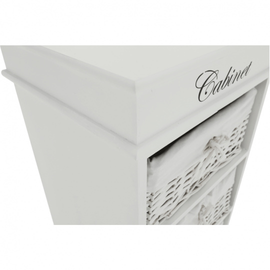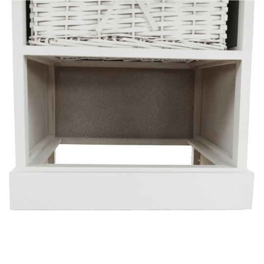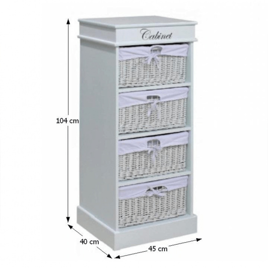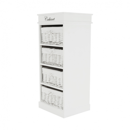 komoda se 4 proutěnými košíky v pevném dřevěném rámu, barevné provedení šedobílé, materiál: dřevo / proutí, rozměry ŠxVxH: 38x86x28 cm. Hmotnost: 4.4kg