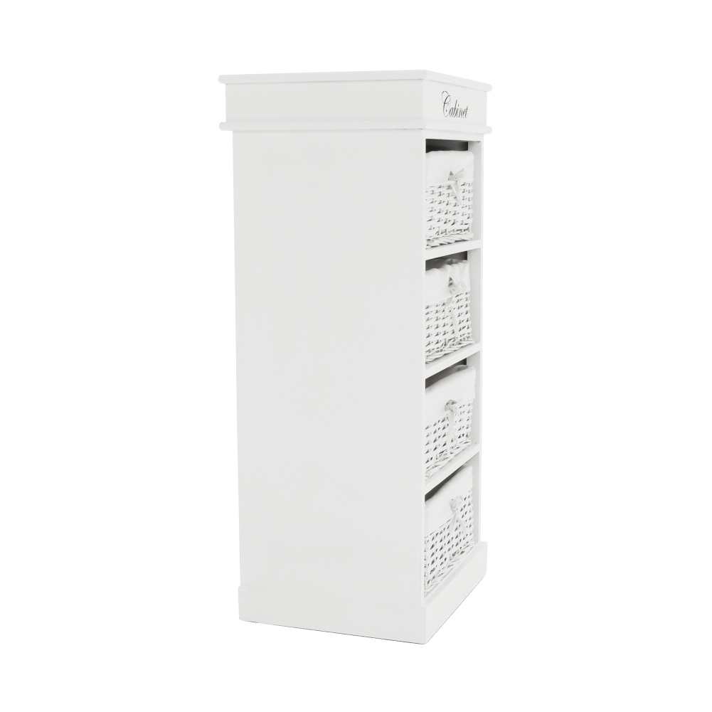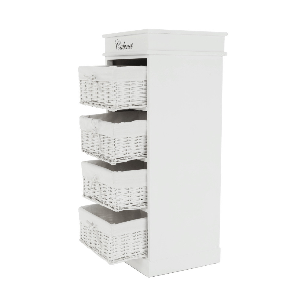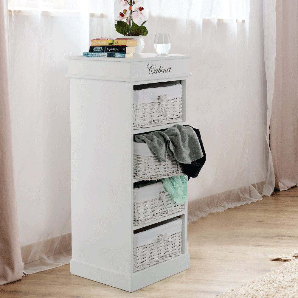 komoda se 4 proutěnými košíky v pevném dřevěném rámu, barevné provedení šedobílé, materiál: dřevo / proutí, rozměry ŠxVxH: 38x86x28 cm. Hmotnost: 4.4kg