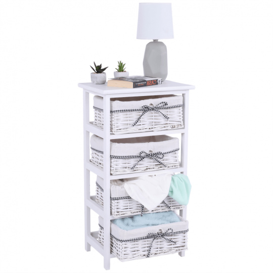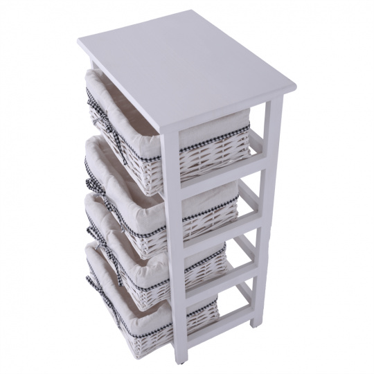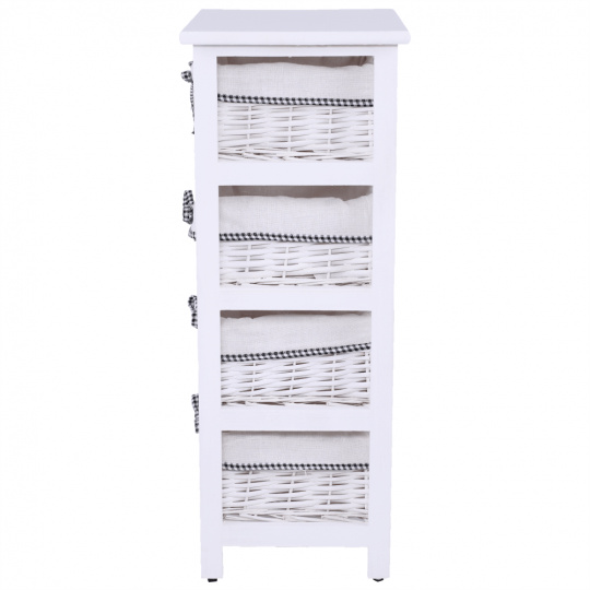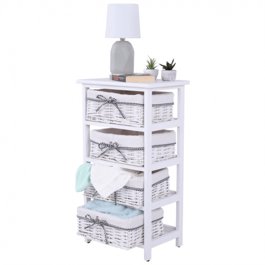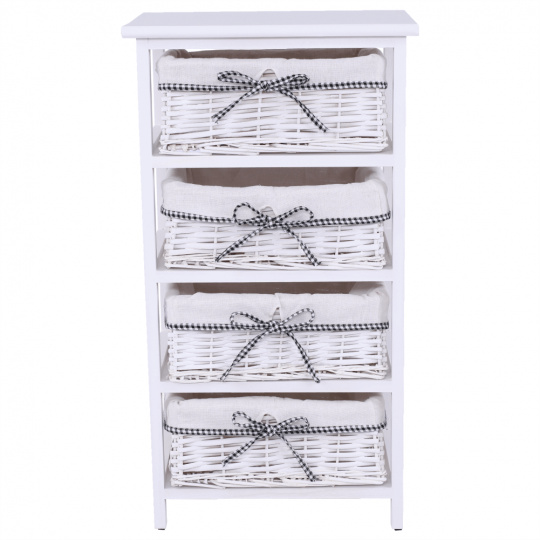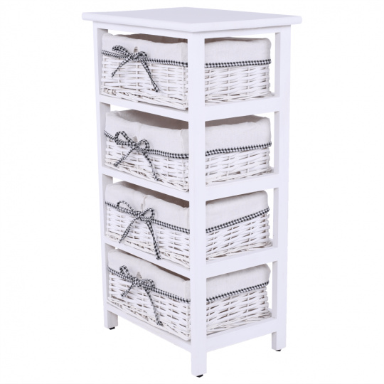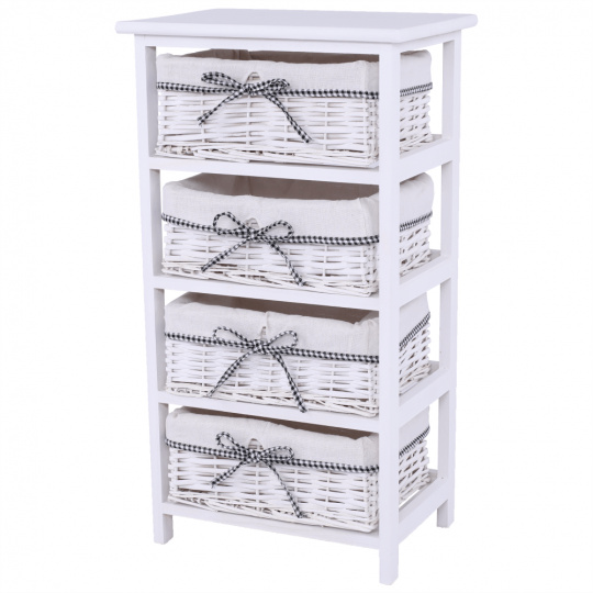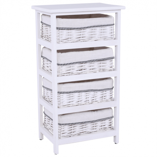komoda s pevným rámem a 4 proutěnými košíky, materiál dřevo / proutí, kombinace starobílé barvy, rozměry (ŠxVxH) 40x73x29 cm.