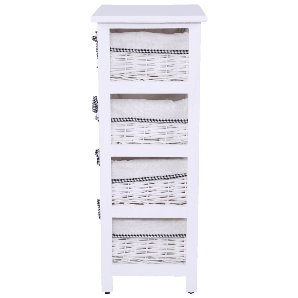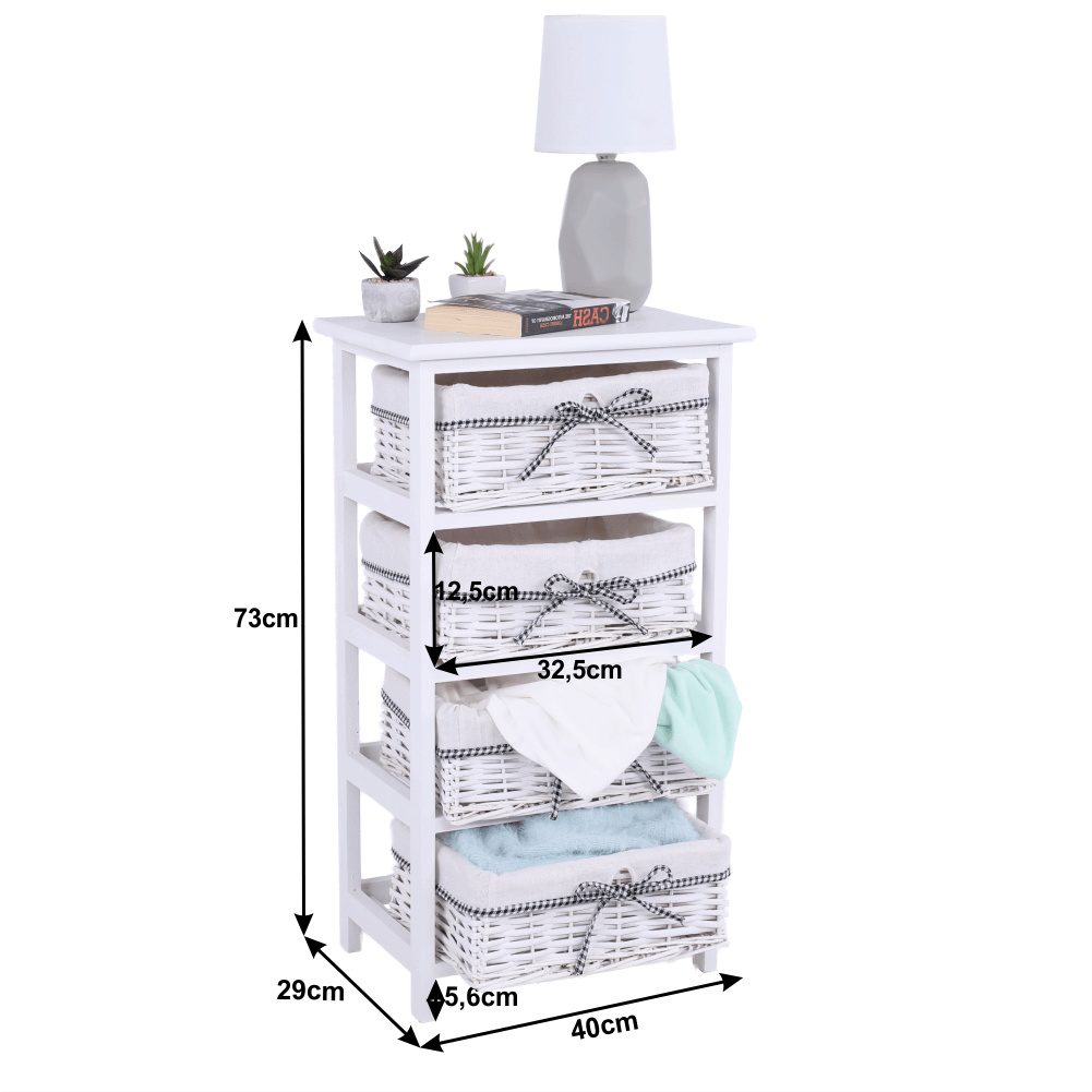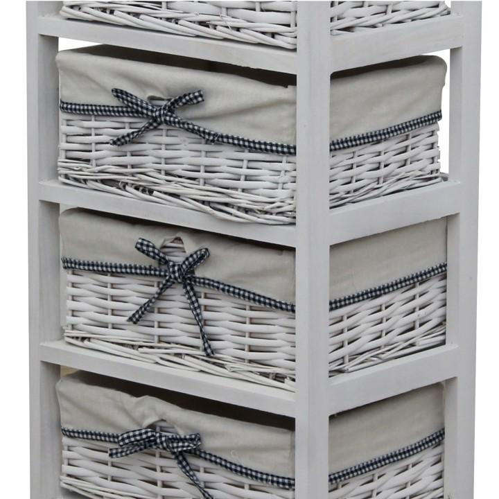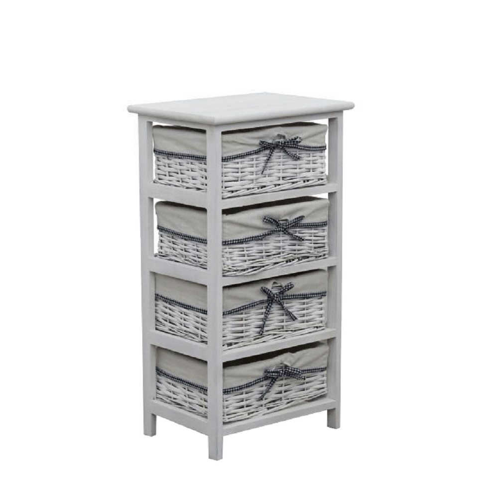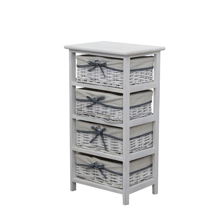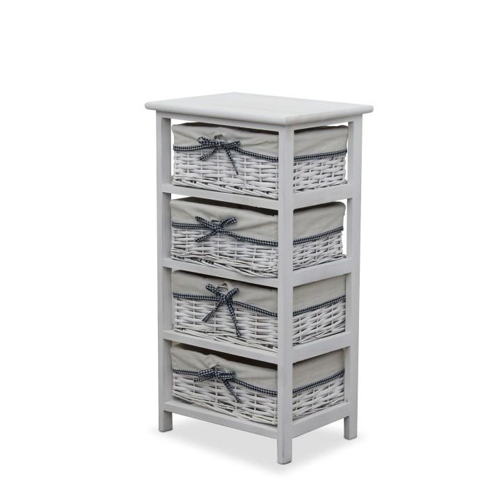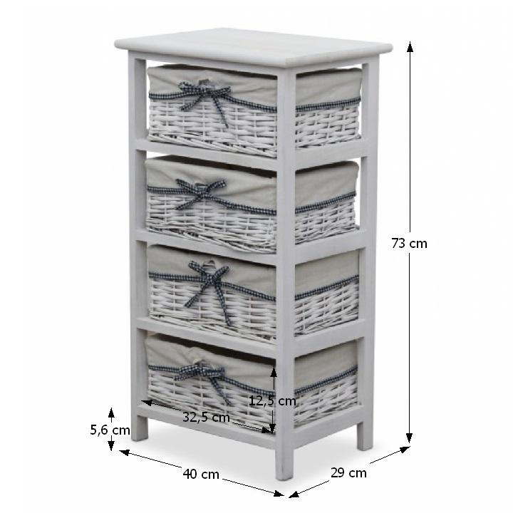komoda s pevným rámem a 4 proutěnými košíky, materiál dřevo / proutí, kombinace starobílé barvy, rozměry (ŠxVxH) 40x73x29 cm.
