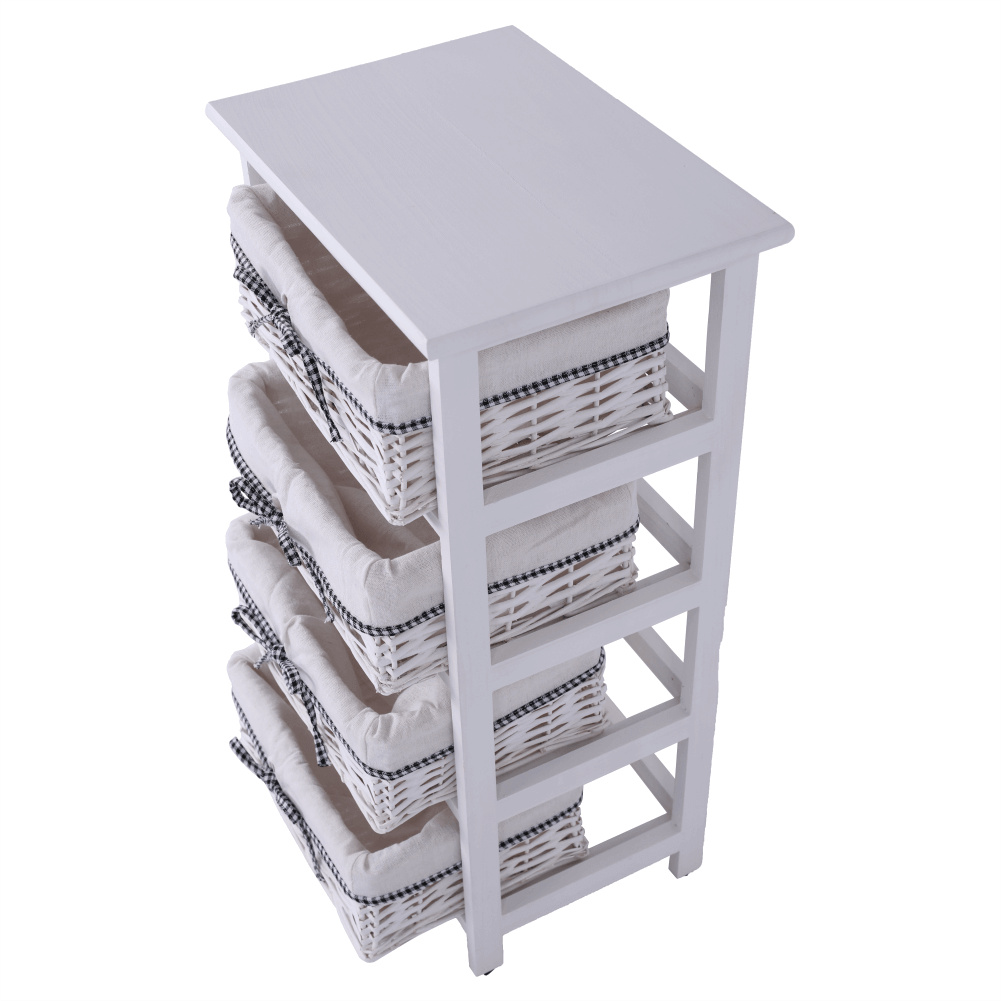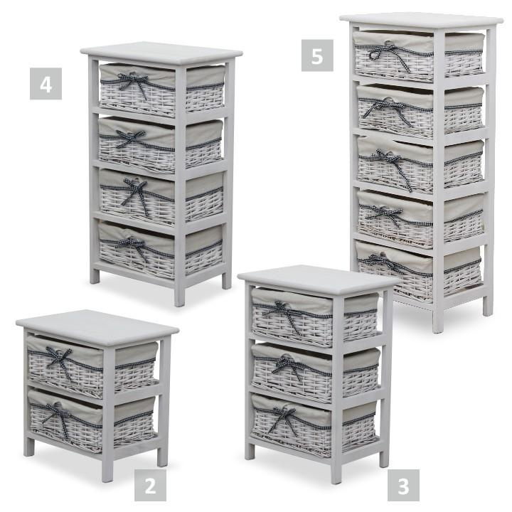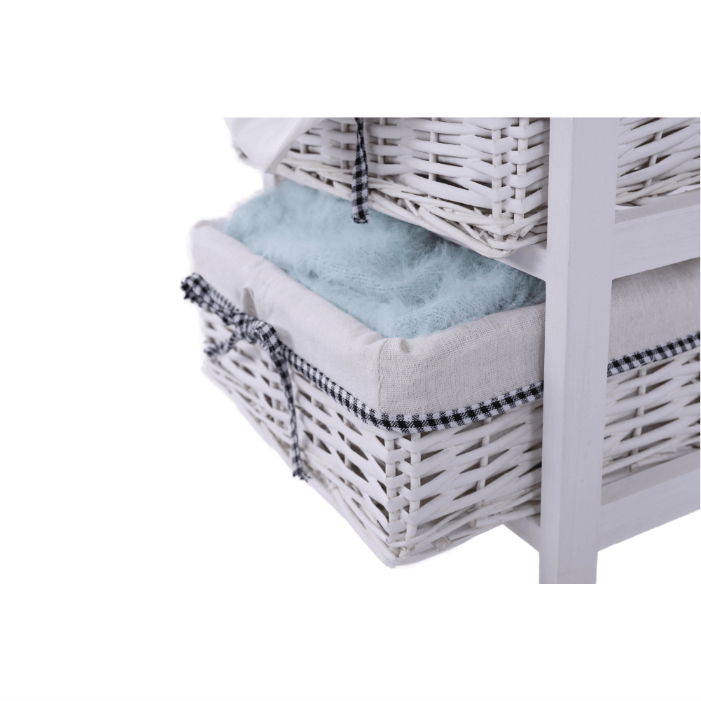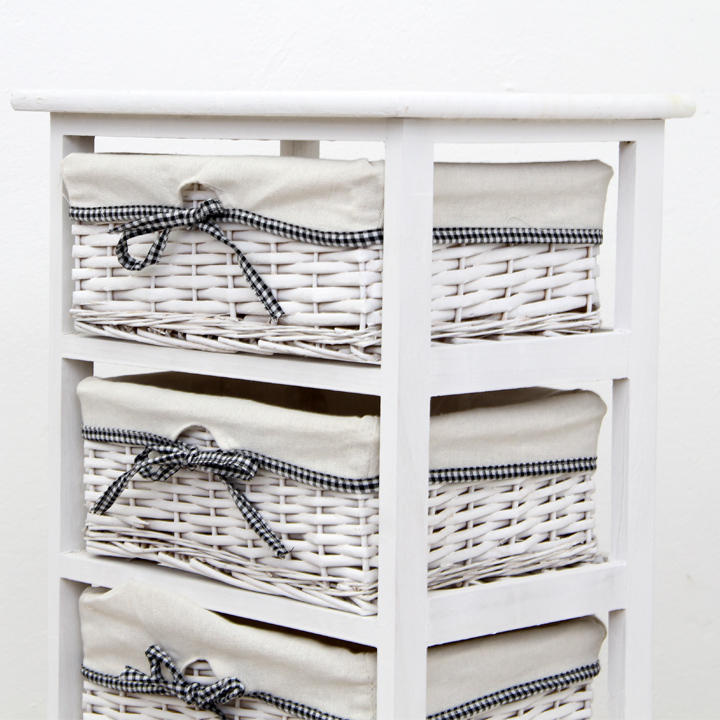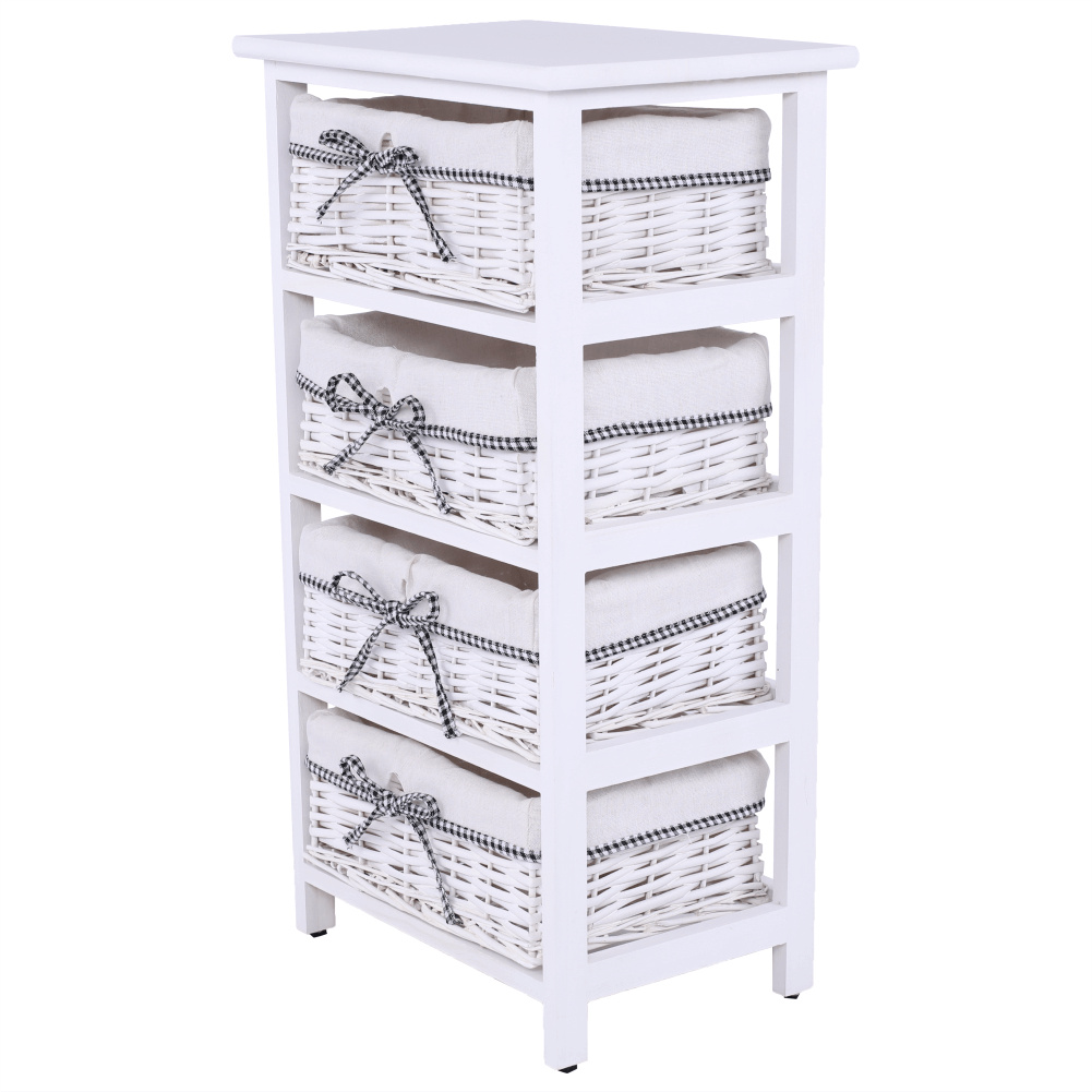 komoda s pevným rámem a 4 proutěnými košíky, materiál dřevo / proutí, kombinace starobílé barvy, rozměry (ŠxVxH) 40x73x29 cm.