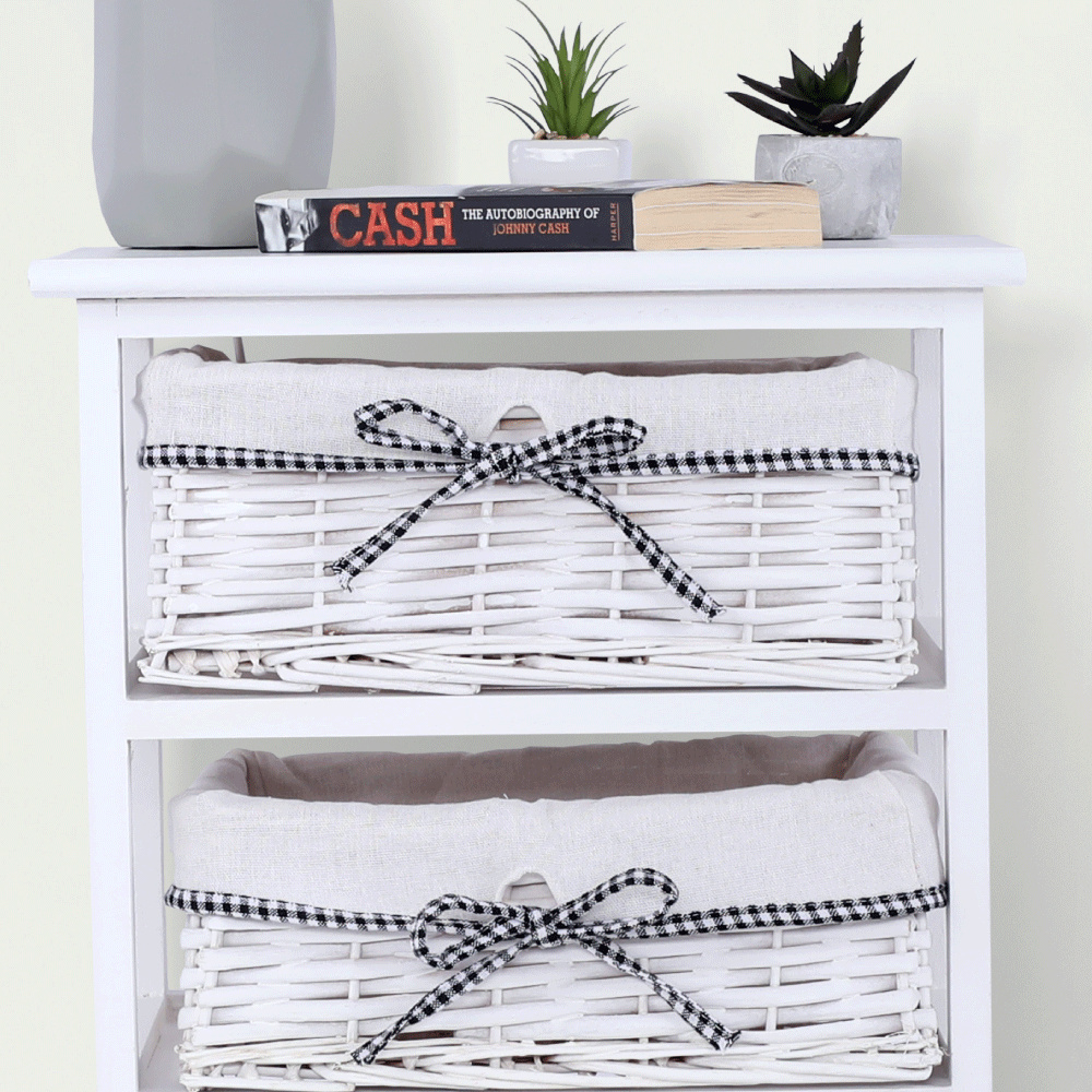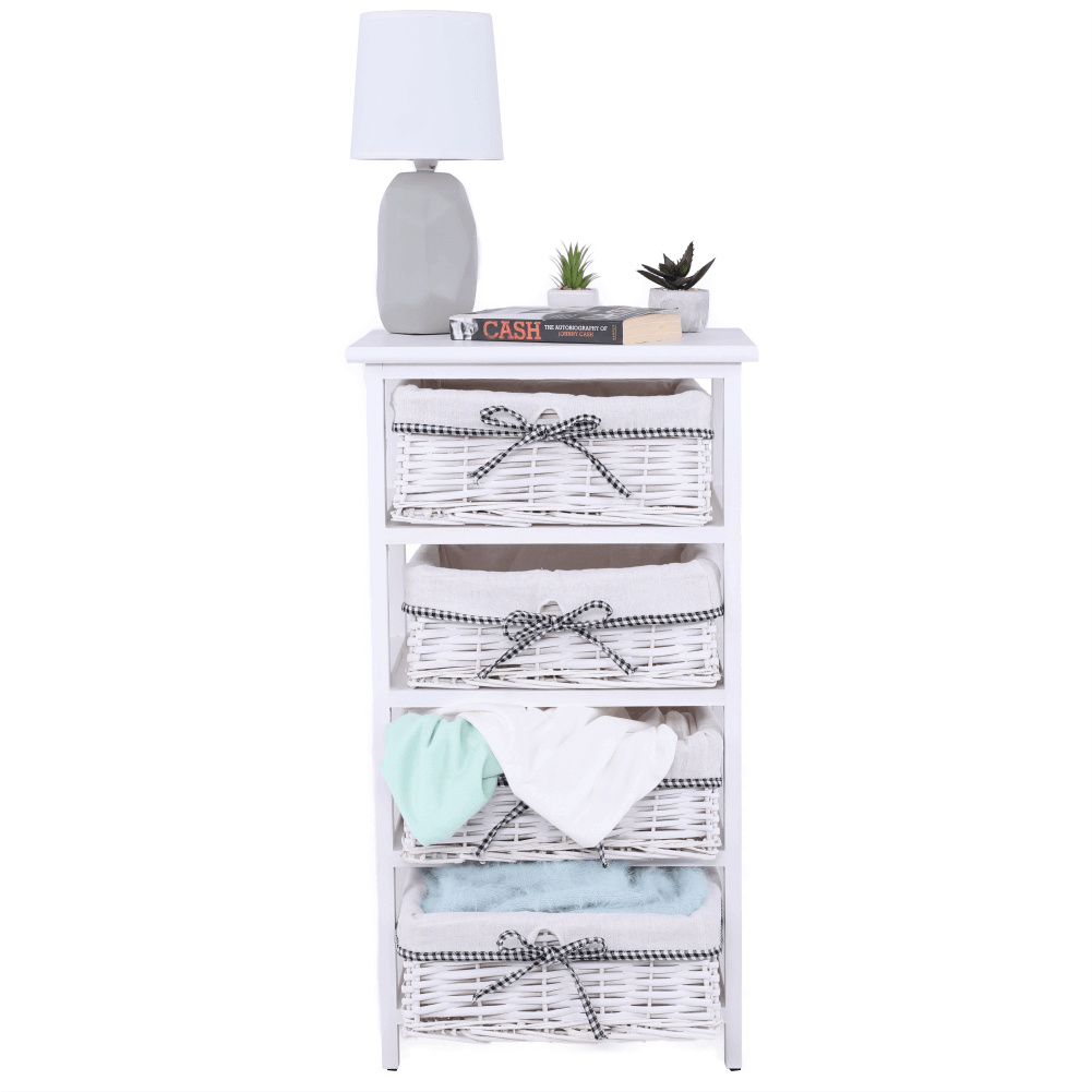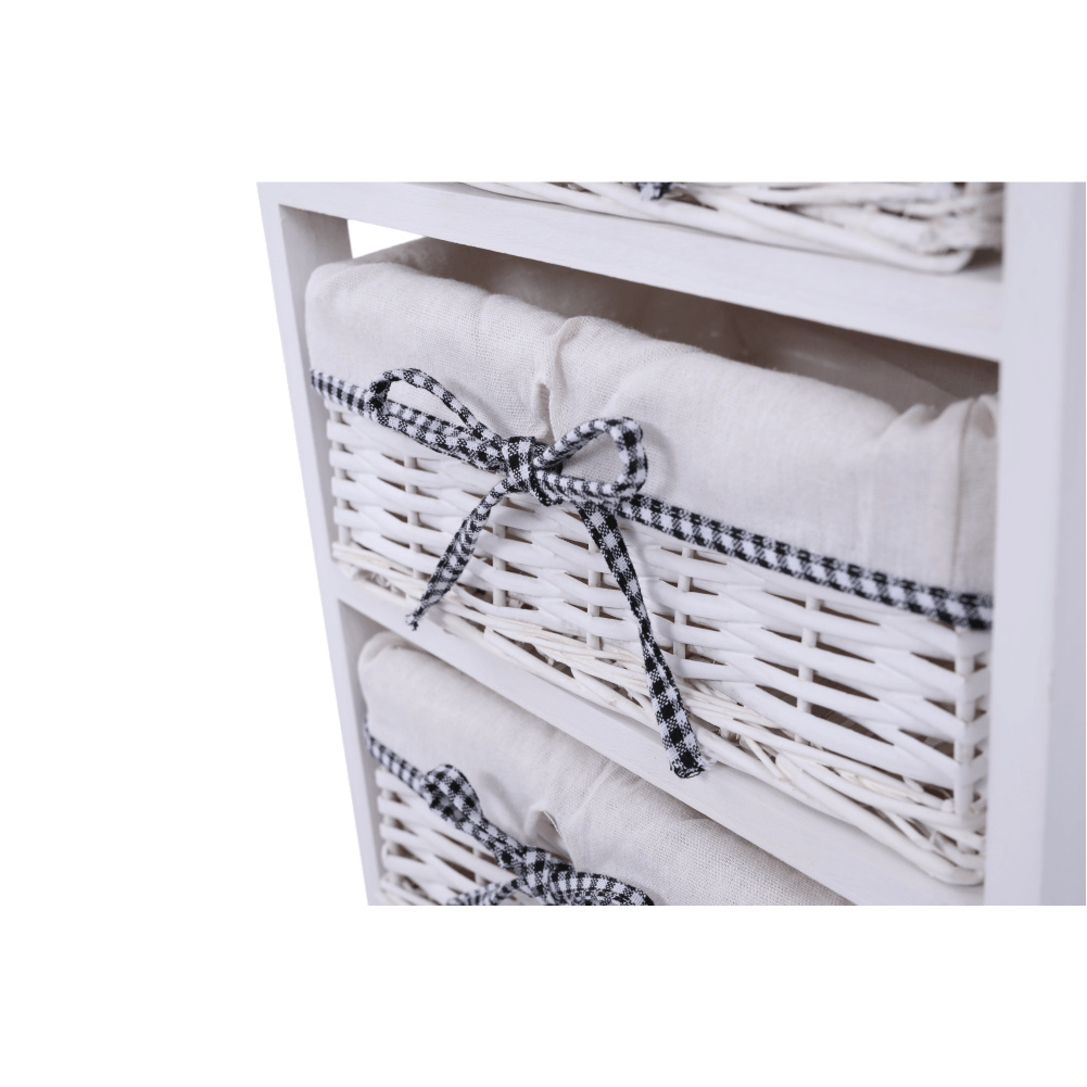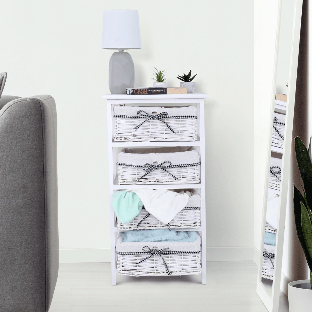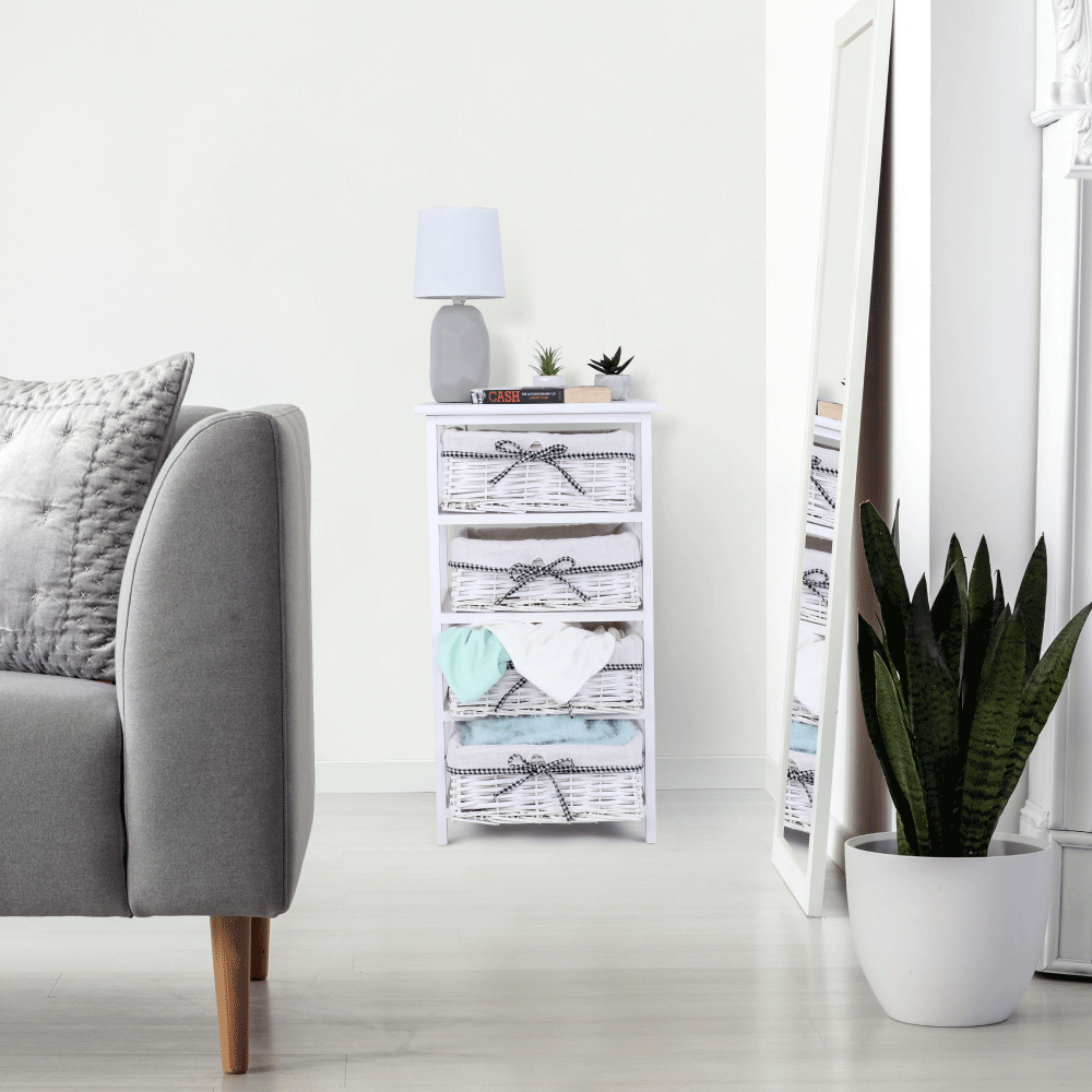 komoda s pevným rámem a 4 proutěnými košíky, materiál dřevo / proutí, kombinace starobílé barvy, rozměry (ŠxVxH) 40x73x29 cm.