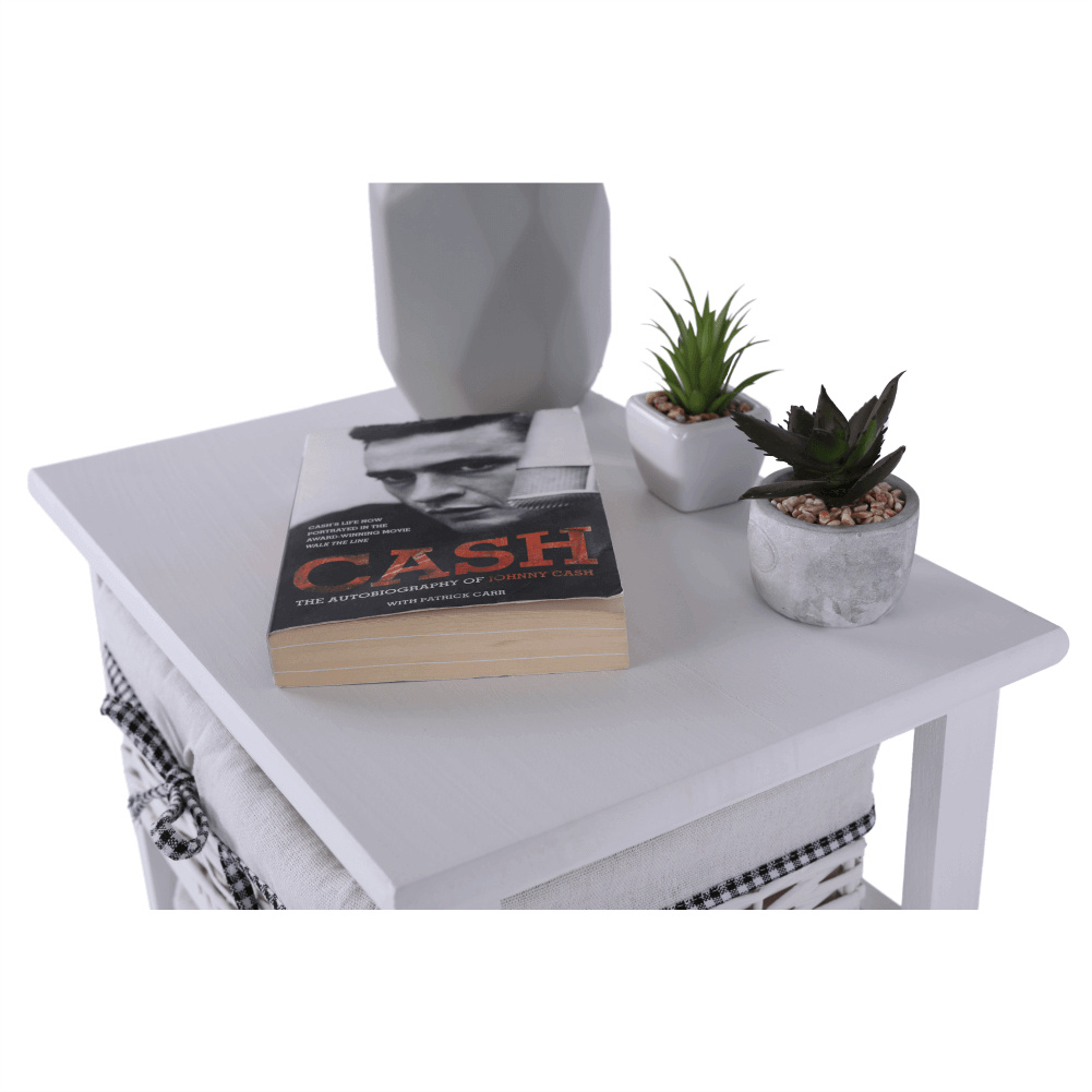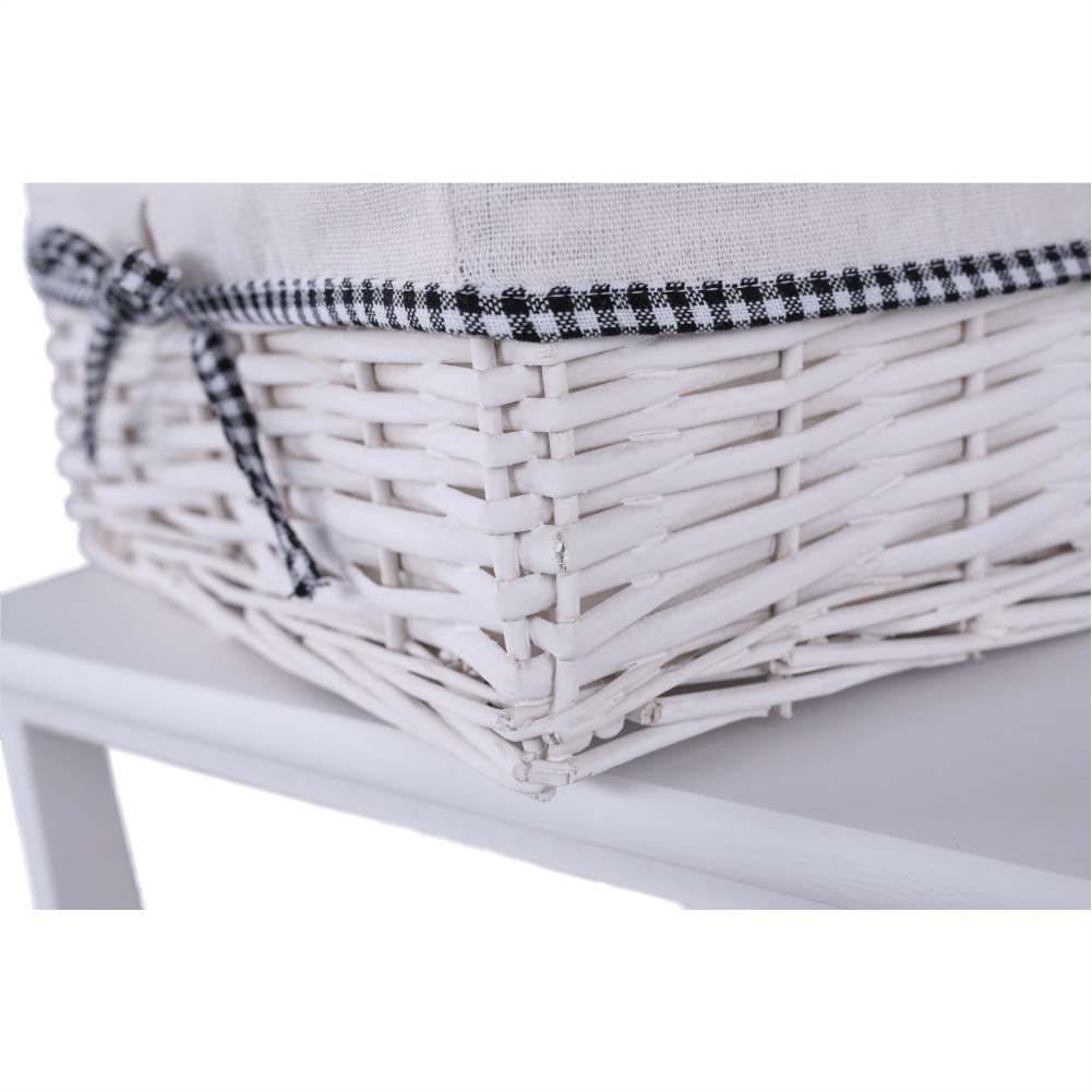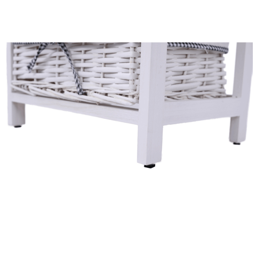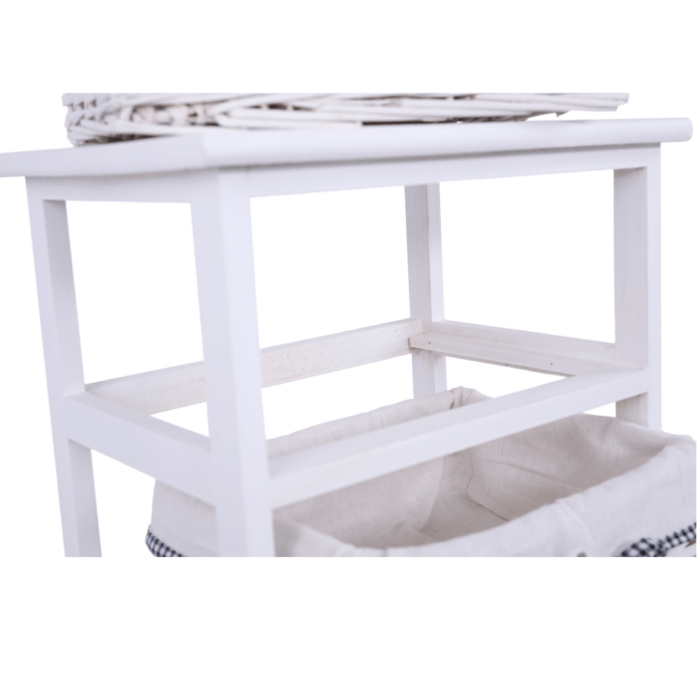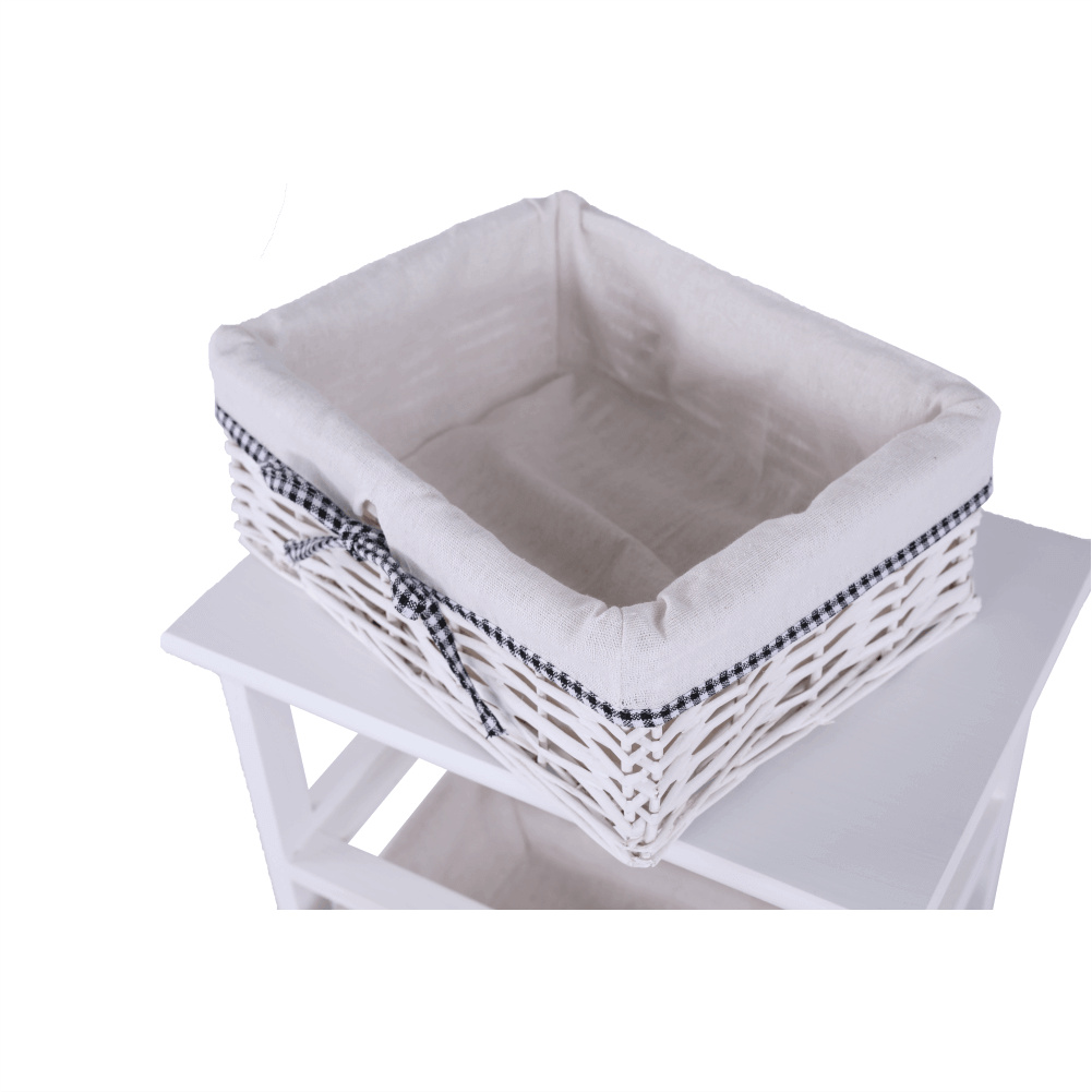 komoda s pevným rámem a 4 proutěnými košíky, materiál dřevo / proutí, kombinace starobílé barvy, rozměry (ŠxVxH) 40x73x29 cm.