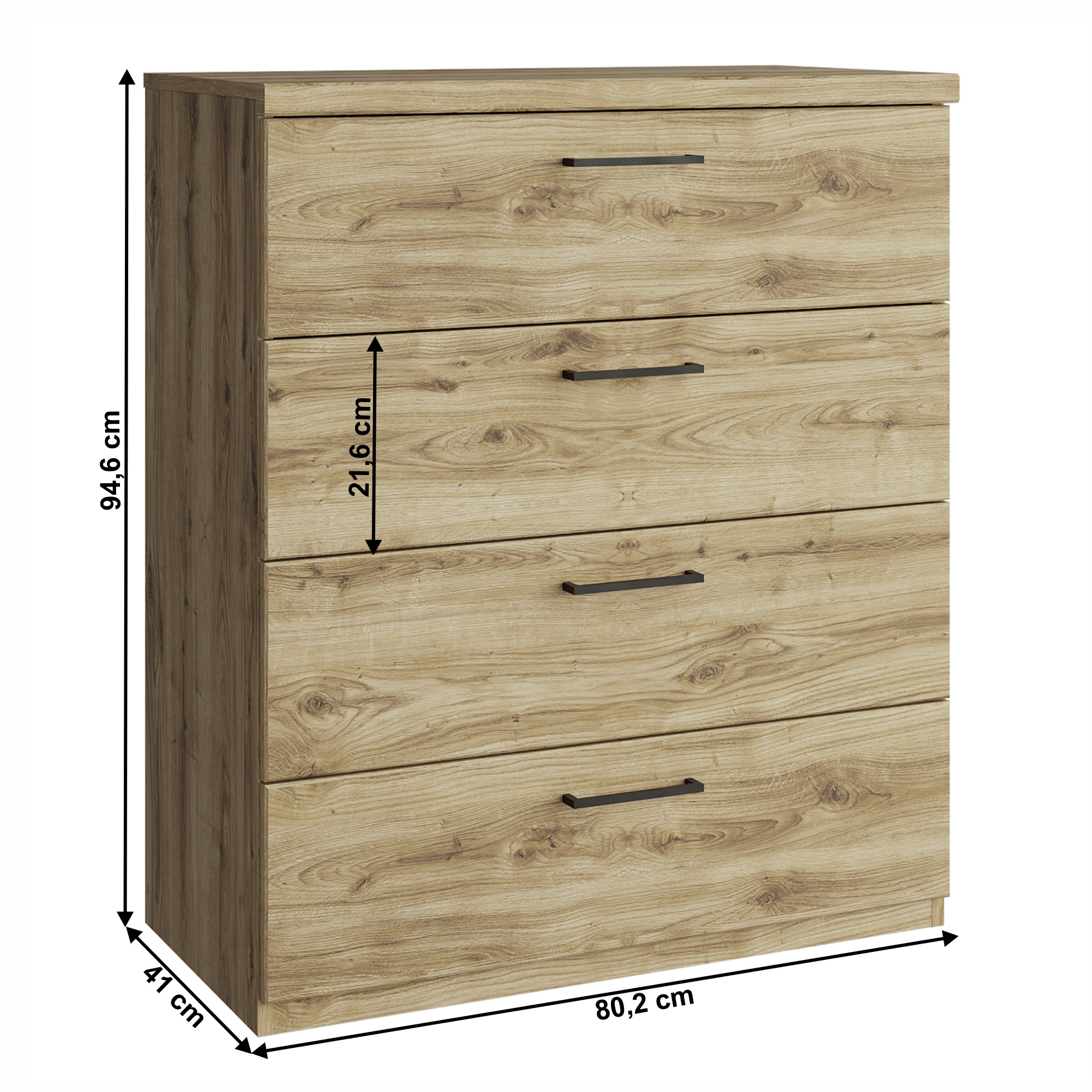 Komoda DORSI 4S Materiál: DTD laminovaná/MDF Barva: dub navarra Rozměry (ŠxHxV): 80,2x41x94,6 cm Tloušťka materiálu: 1,6 cm Čtyři šuplíky Výška šuplíků: 21,6 cm Plastové úchytky Barva úchytek: černá Moderní design Dodáváno v demontu