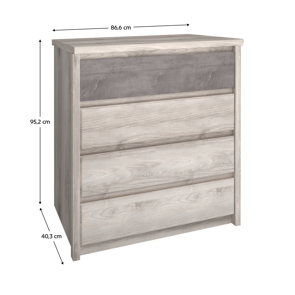 Materiál: DTD laminovaná Barva: kaštan nairobi/onyx Rozměry (ŠxHxV): 86,6x95,2x40,3 cm Tloušťka materiálu: 1,6-3,2 cm Čtyři šuplíky Nosnost šuplíku: 5 kg Plastové nožičky Moderní design Dodáváno v demontu