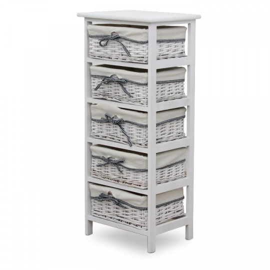 komoda s pevným rámem a 5 proutěnými košíky, materiál dřevo / proutí, kombinace starobílé barvy, rozměry (ŠxVxH) 40x90x29 cm.