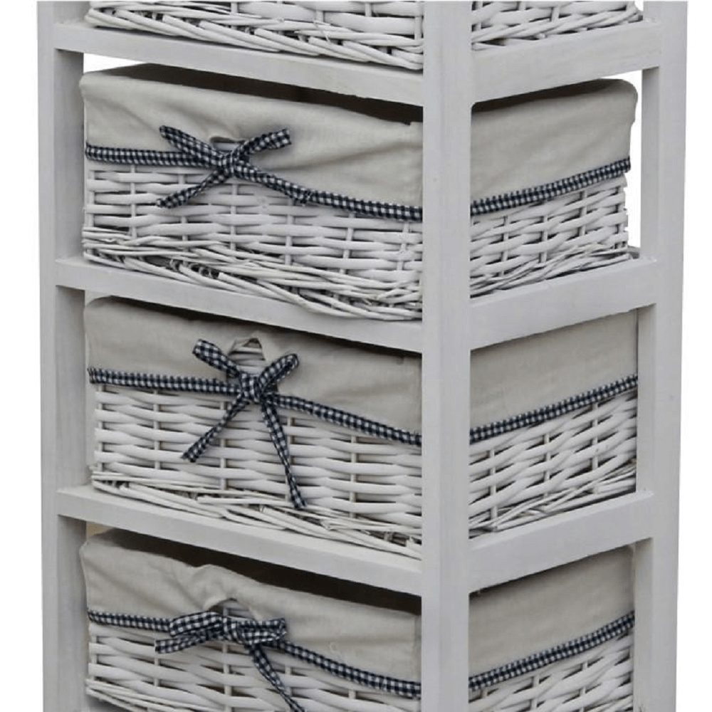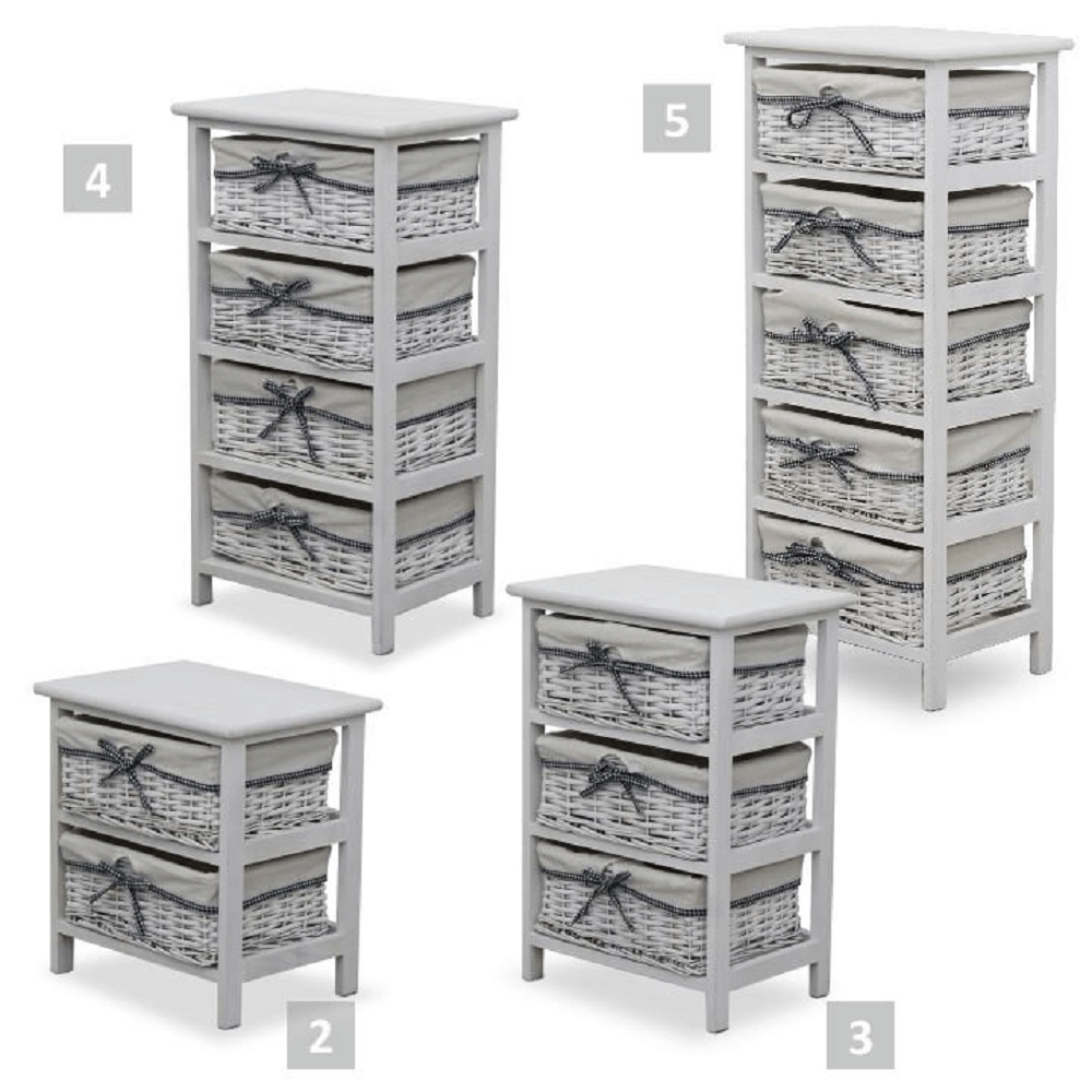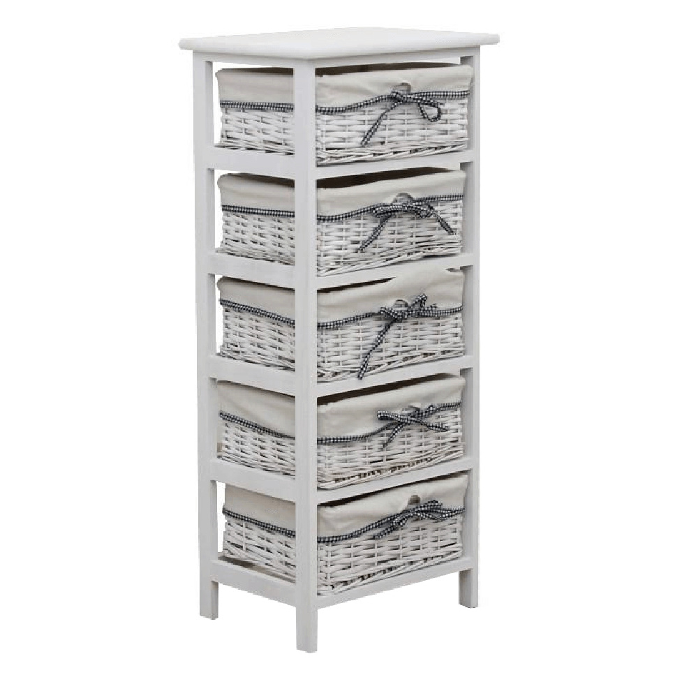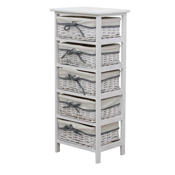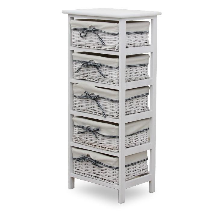 komoda s pevným rámem a 5 proutěnými košíky, materiál dřevo / proutí, kombinace starobílé barvy, rozměry (ŠxVxH) 40x90x29 cm.