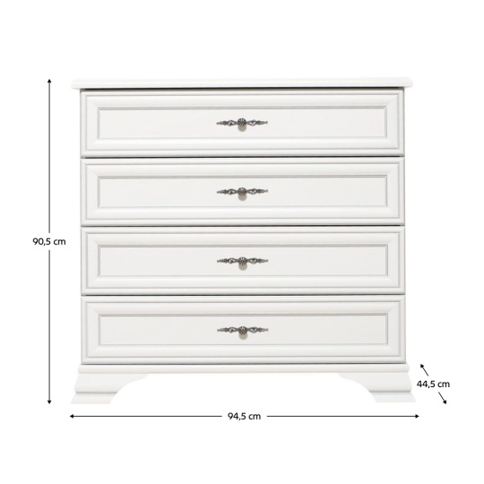 Materiál: DTD laminovaná Barva: alpská bílá Rozměry (ŠxHxV): 94,5x44,5x90,5 cm Tloušťka materiálu: 1,6 cm Kovové úchytky Barva úchytek: antické stříbro Šuplíky Nosnost šuplíku: 3 kg Nosnost vrchní desky: 15 kg Na nožičkách Výška nožiček: 8 cm Dodáváno v demontu