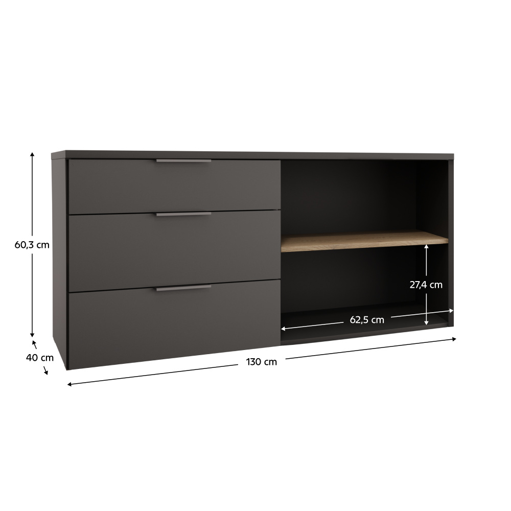 Materiál: DTD laminovaná/ABS hrany Barva: antracit/dub cremona Rozměry (ŠxHxV): 130x40x63 cm Tloušťka materiálu: 1,6-2,2 cm Tři šuplíky Kovové výsuvy Police Otevřený úložný prostor Kovové úchytky Barva úchytek: černá Plastové kluzáky Výška plastových kluzáků: 0,5 cm Doporučujeme připevnit ke zdi Dodáváno v demontu