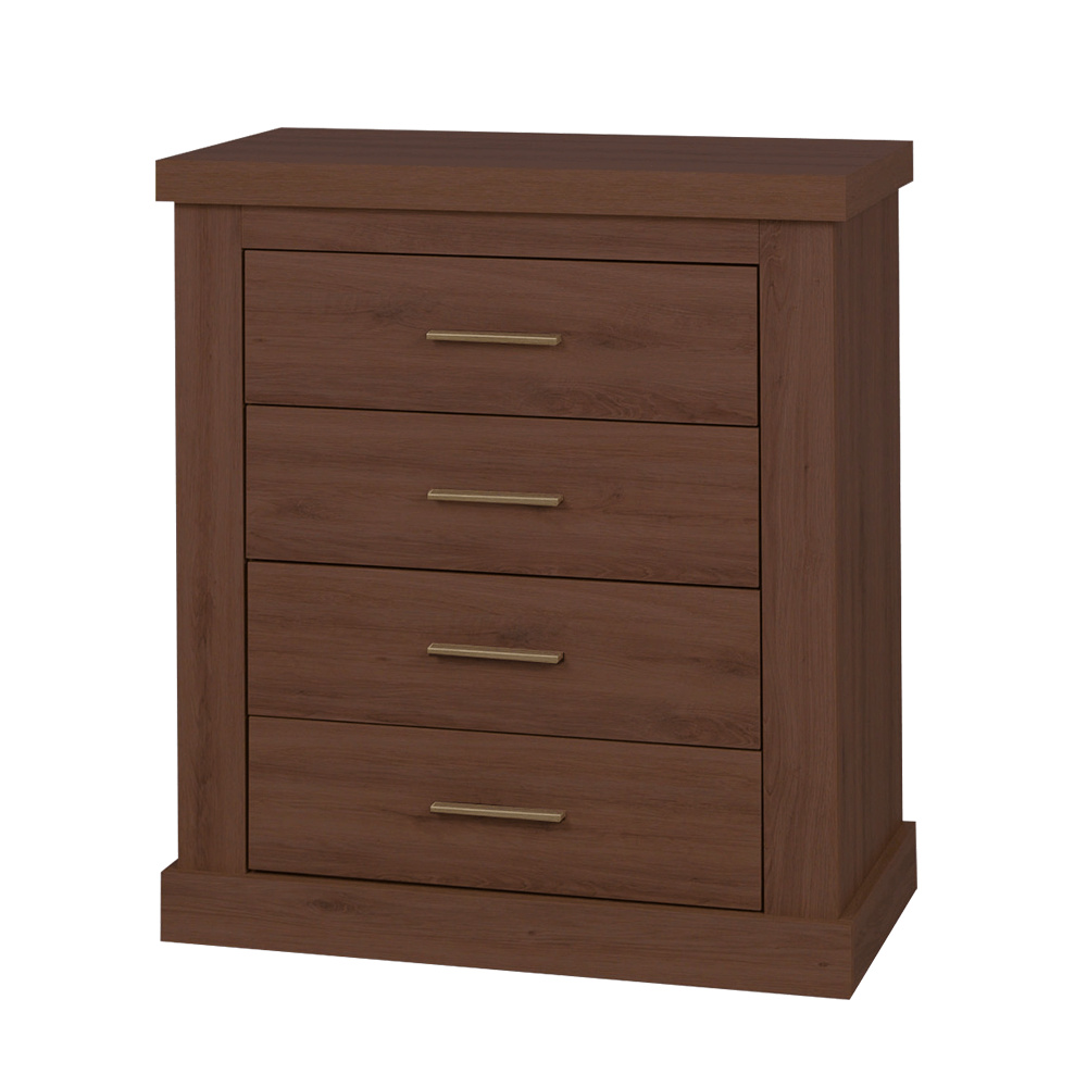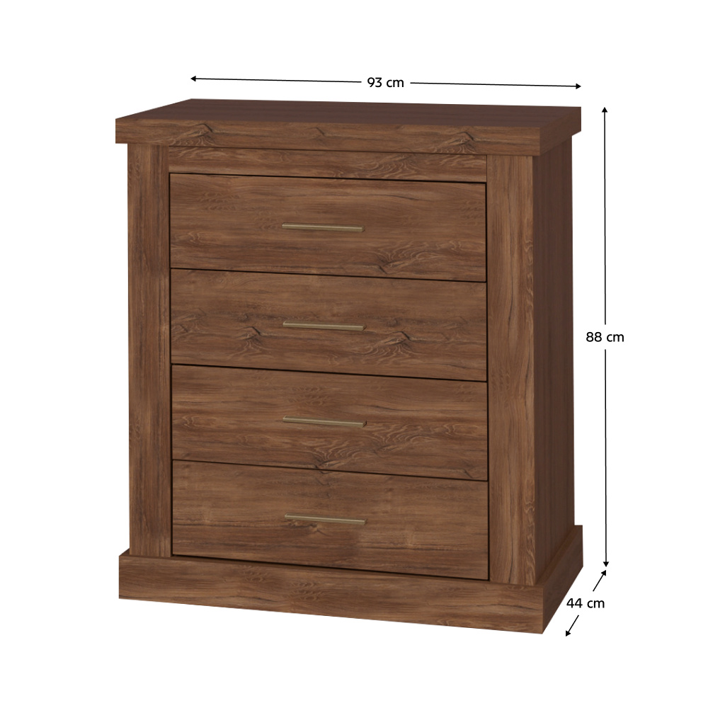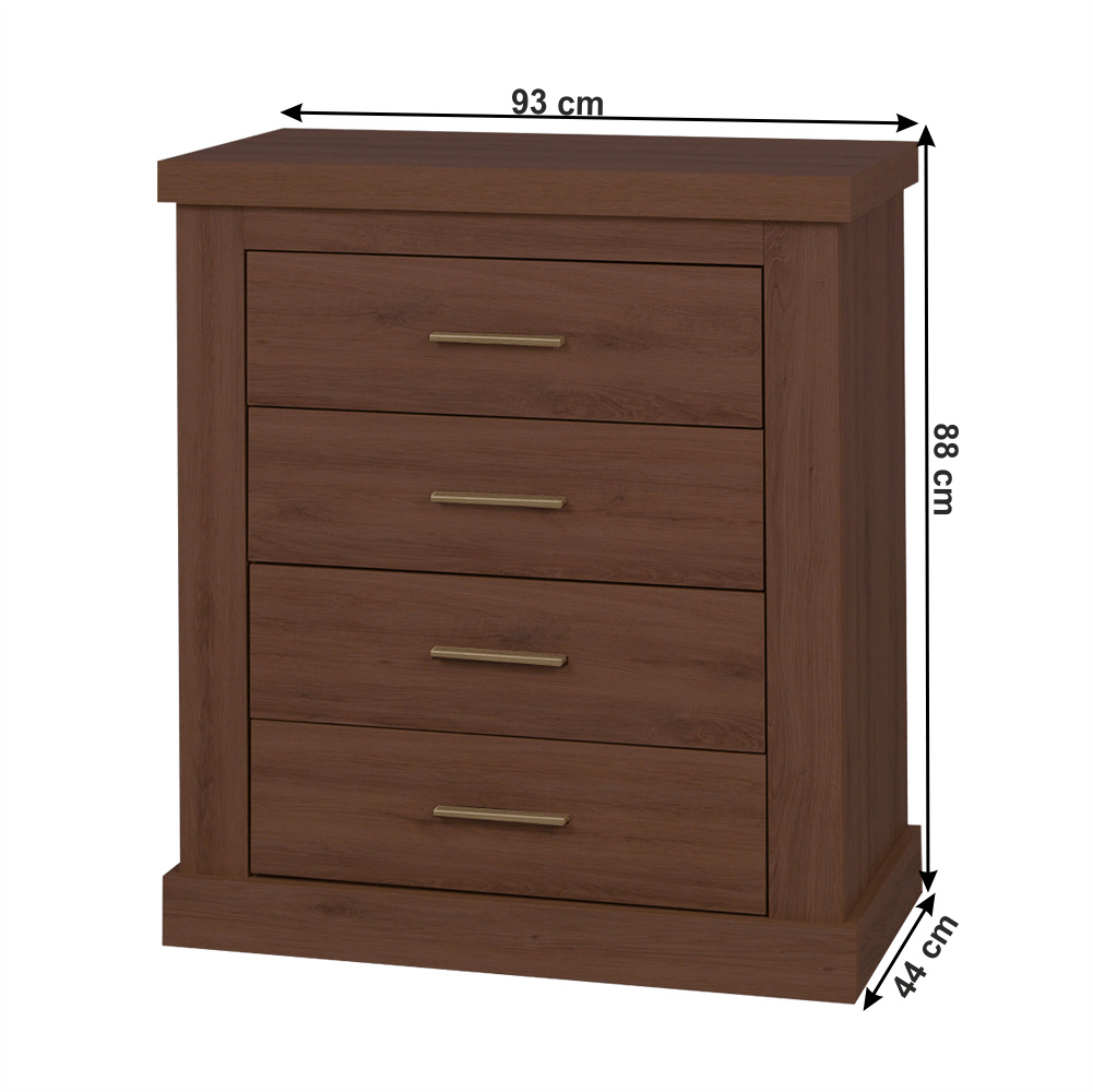 Materiál: DTD laminovaná / ABS hrany Barva: dub stirling Rozměry (ŠxHxV): 93x44x88 cm Tloušťka materiálu: 50 mm 3D efekt kovové úchytky ABS hrany čtyři šuplíky Dodávané v demontu