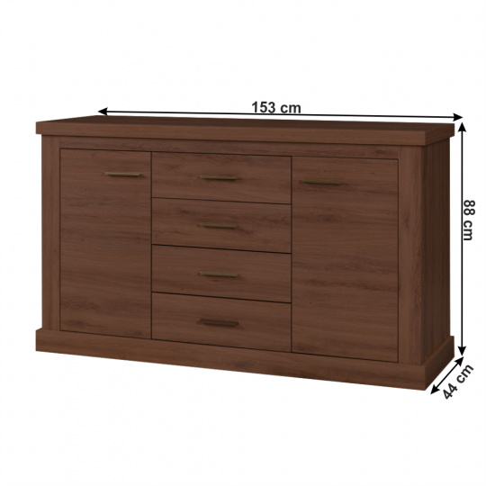 Materiál: DTD laminovaná / ABS hrany Barva: dub stirling Rozměry (ŠxHxV): 153x44x88 cm Tloušťka materiálu: 50 mm 3D efekt kovové úchytky ABS hrany čtyři šuplíky Dvě jednodveřové skříňky Dodávané v demontu