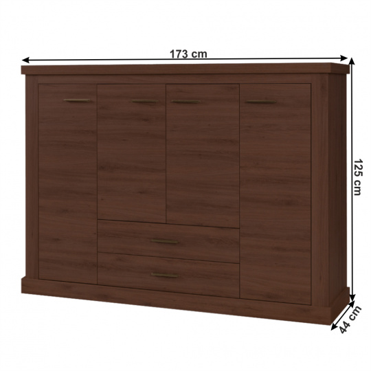 Materiál: DTD laminovaná / ABS hrany Barva: dub stirling Rozměry (ŠxHxV): 173x44x125 cm Tloušťka materiálu: 50 mm 3D efekt kovové úchytky ABS hrany dva šuplíky tři skříňky Dodávané v demontu