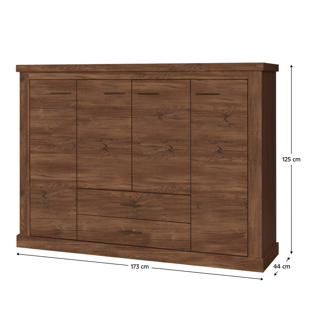 Materiál: DTD laminovaná / ABS hrany Barva: dub stirling Rozměry (ŠxHxV): 173x44x125 cm Tloušťka materiálu: 50 mm 3D efekt kovové úchytky ABS hrany dva šuplíky tři skříňky Dodávané v demontu
