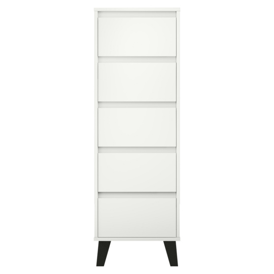 Materiál: laminovaná DTD Barva: bílá Rozměry (ŠxHxV): 40x38,8x120,4 cm Výška spodního prostoru od podlahy: 12 cm Pět šuplíků Rozměr šuplíku (ŠxV): 36,2x18 cm Vnitřní rozměr šuplíku (ŠxHxV): 30,8x33,3x9 cm Na nožičkách Barva nožiček: černá Nosnost šuplíku: 5 kg Nosnost vrchní desky: 15 kg Moderní styl Bez úchytek Doporučujeme připevnit ke zdi Dodáváno v demontu
