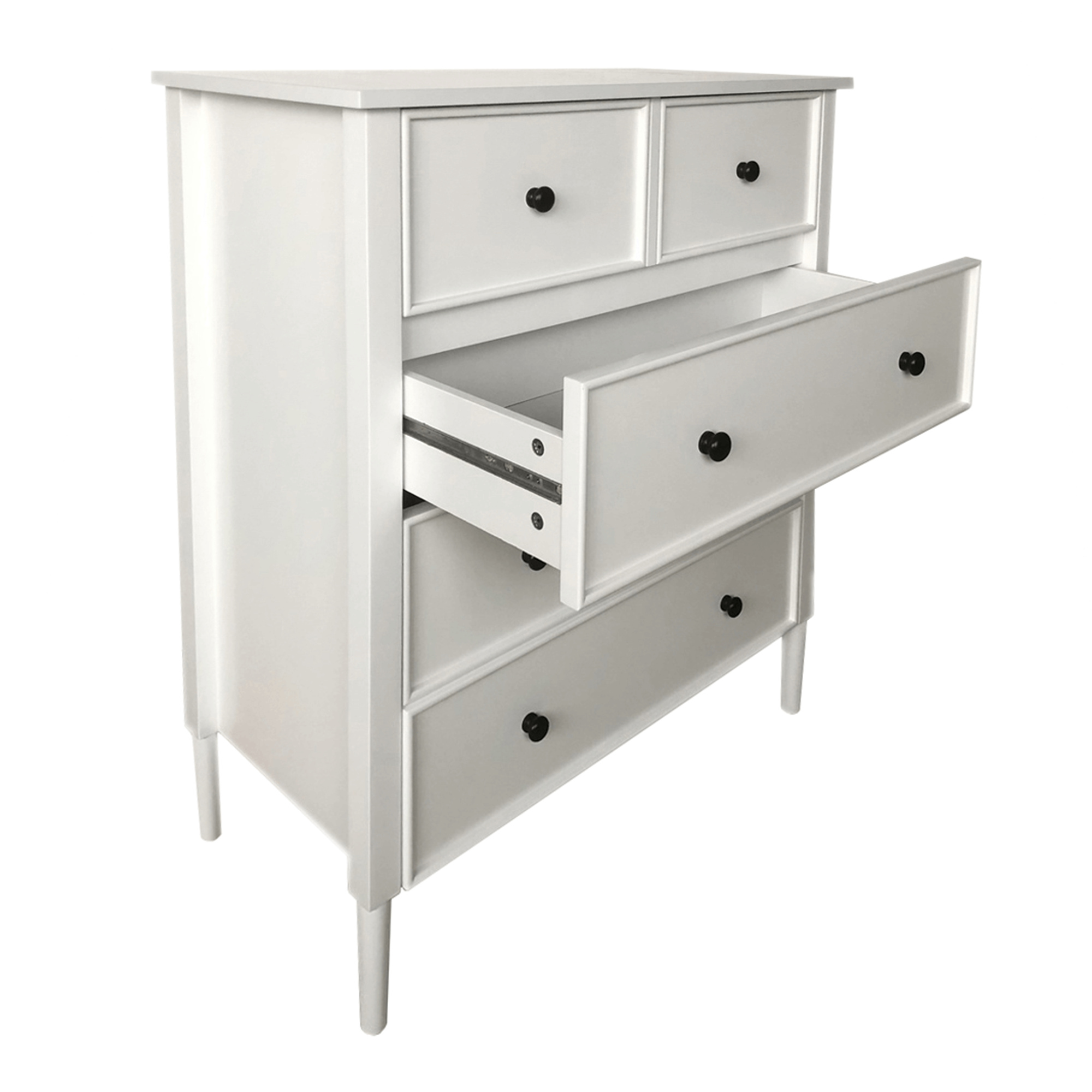 Materiál: MDF Barva: bílá Rozměry (ŠxHxV): 80x40x95cm Tloušťka materiálu: 1,5 - 3,7 cm Tři větší šuplíky Dva menší šuplíky Dřevěné úchytky Barva úchytek: černá Nosnost: 30 kg Nosnost šuplíku: 10 kg Na nožičkách Výška nožiček: 15 cm Doporučujeme připevnit ke zdi Provensálský styl Dodáváno v demontu