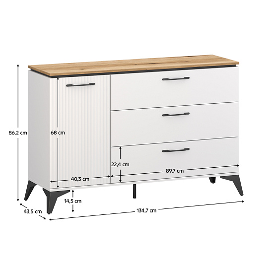Materiál: laminovaná DTD/fóliovaná MDF/PVC Barva: bílá/dub evoke Rozměry (ŠxHxV): 134,7x43,5x86,2 cm Tloušťka materiálu: 1,6 cm Jednodveřová Police Tři zásuvky Nosnost zásuvky: 5 kg Nosnost vrchní desky: 30 kg Kovové úchytky Barva úchytek: černá Kovové nožičky Barva nožiček: černá Výška nožiček: 14,5 cm Středová podpůrná nožička Dekorativní rýhovaná dvířka Moderní design Doporučujeme připevnit ke zdi Dodáváno v demontu