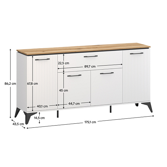 Materiál: laminovaná DTD/fóliovaná MDF/PVC Barva: bílá/dub evoke Rozměry (ŠxHxV): 134,7x43,5x86,2 cm Tloušťka materiálu: 1,6 cm Jednodveřová Police Tři zásuvky Nosnost zásuvky: 5 kg Nosnost vrchní desky: 30 kg Kovové úchytky Barva úchytek: černá Kovové nožičky Barva nožiček: černá Výška nožiček: 14,5 cm Středová podpůrná nožička Dekorativní rýhovaná dvířka Moderní design Doporučujeme připevnit ke zdi Dodáváno v demontu