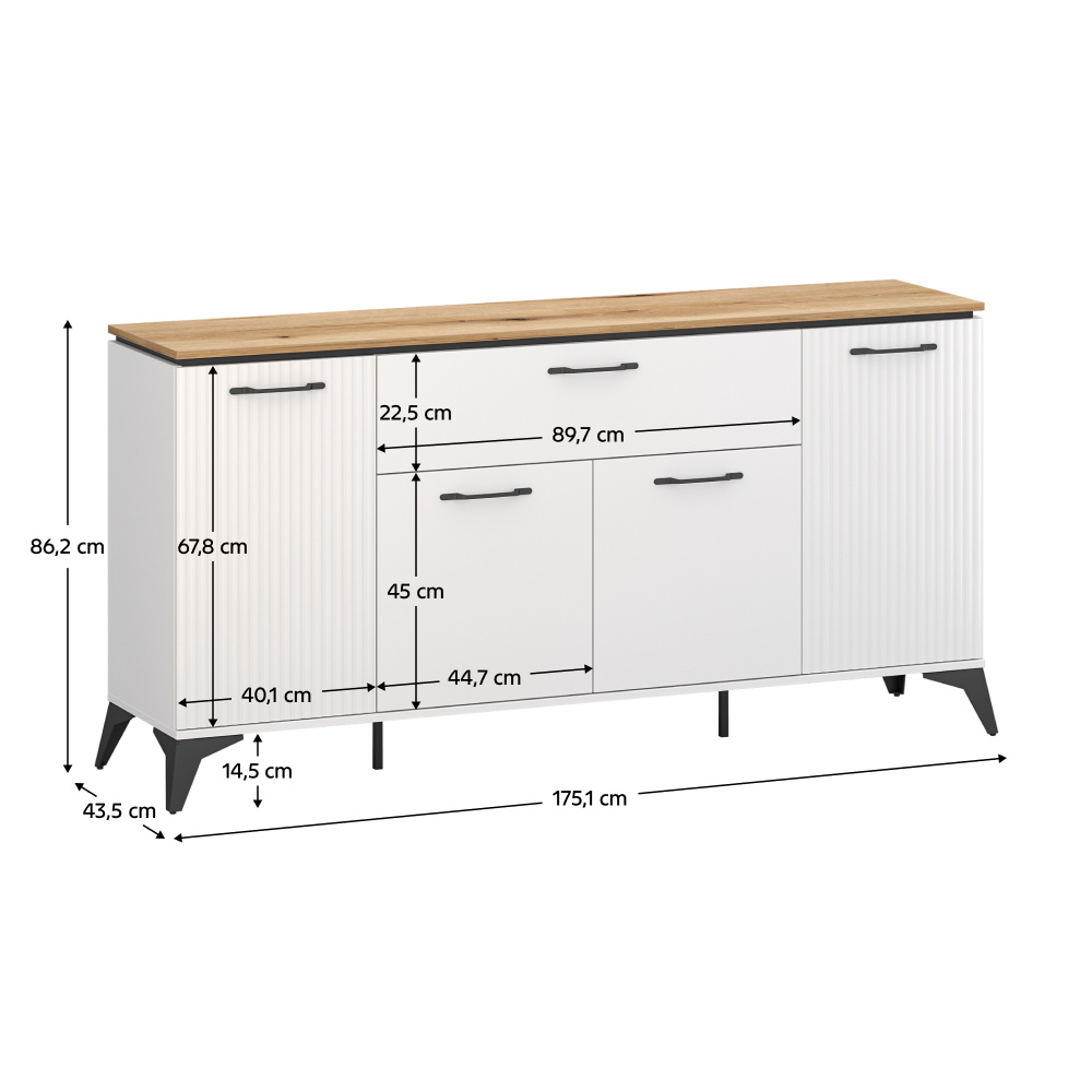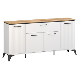 Materiál: laminovaná DTD/fóliovaná MDF/PVC Barva: bílá/dub evoke Rozměry (ŠxHxV): 134,7x43,5x86,2 cm Tloušťka materiálu: 1,6 cm Jednodveřová Police Tři zásuvky Nosnost zásuvky: 5 kg Nosnost vrchní desky: 30 kg Kovové úchytky Barva úchytek: černá Kovové nožičky Barva nožiček: černá Výška nožiček: 14,5 cm Středová podpůrná nožička Dekorativní rýhovaná dvířka Moderní design Doporučujeme připevnit ke zdi Dodáváno v demontu